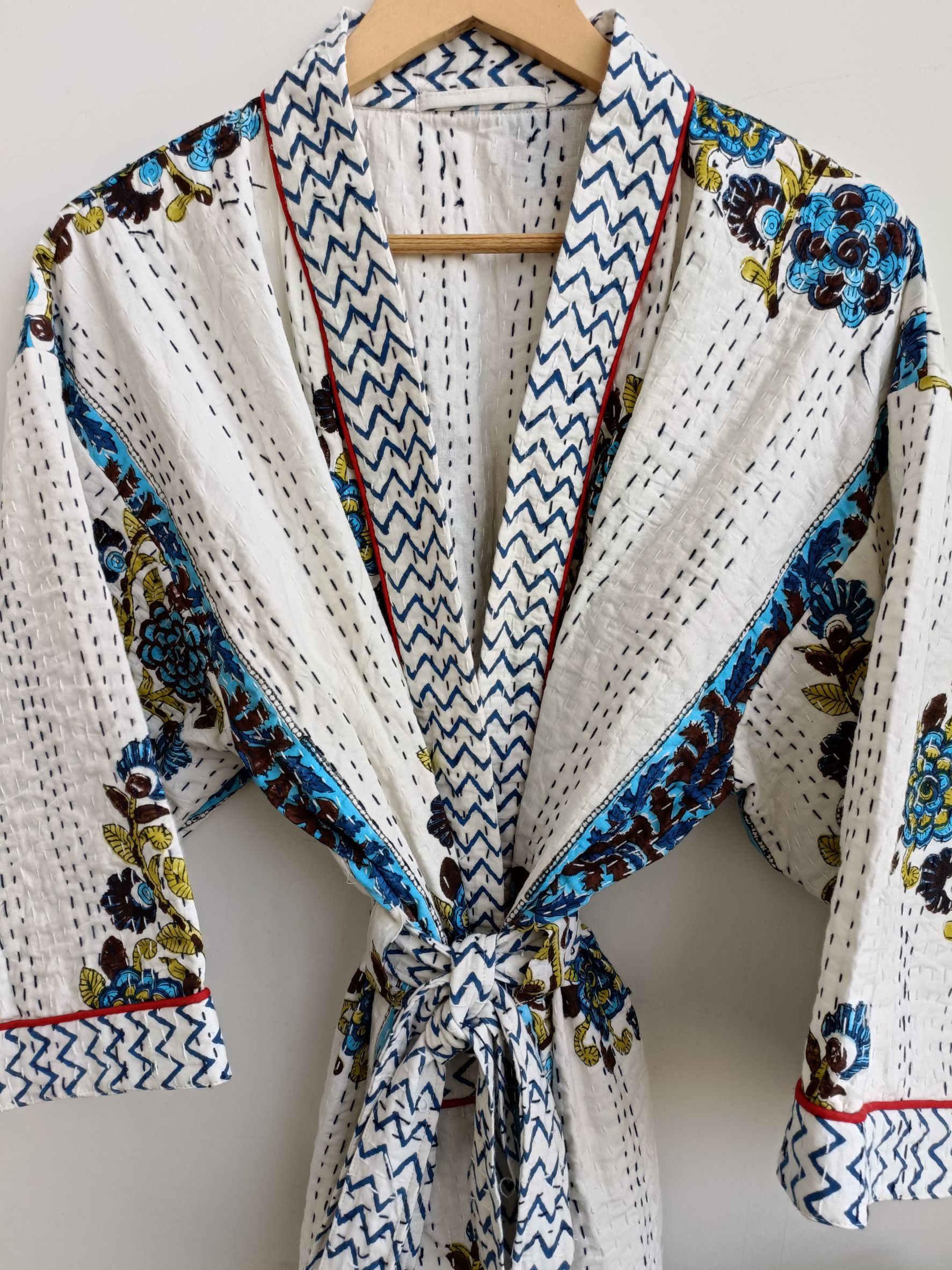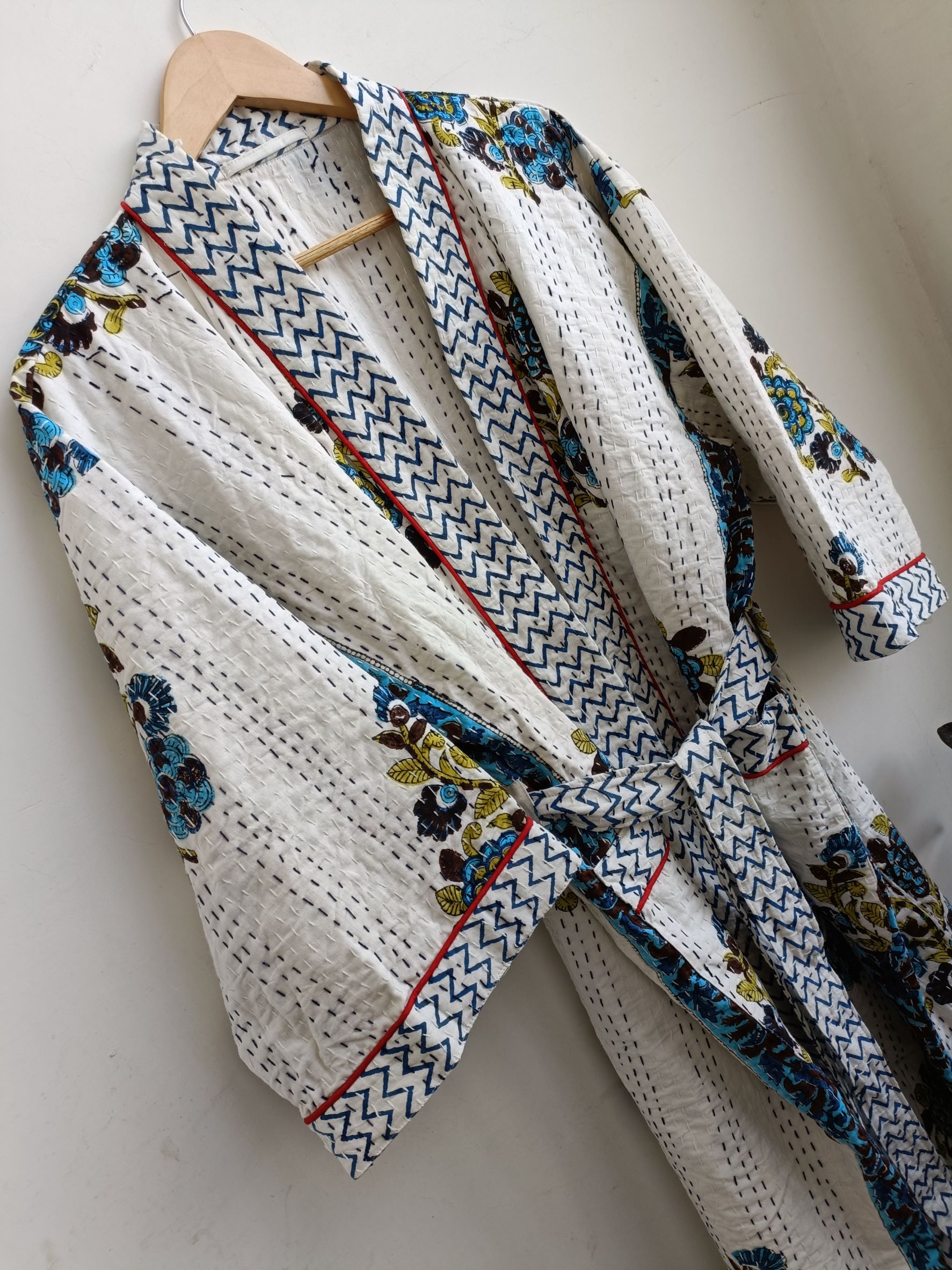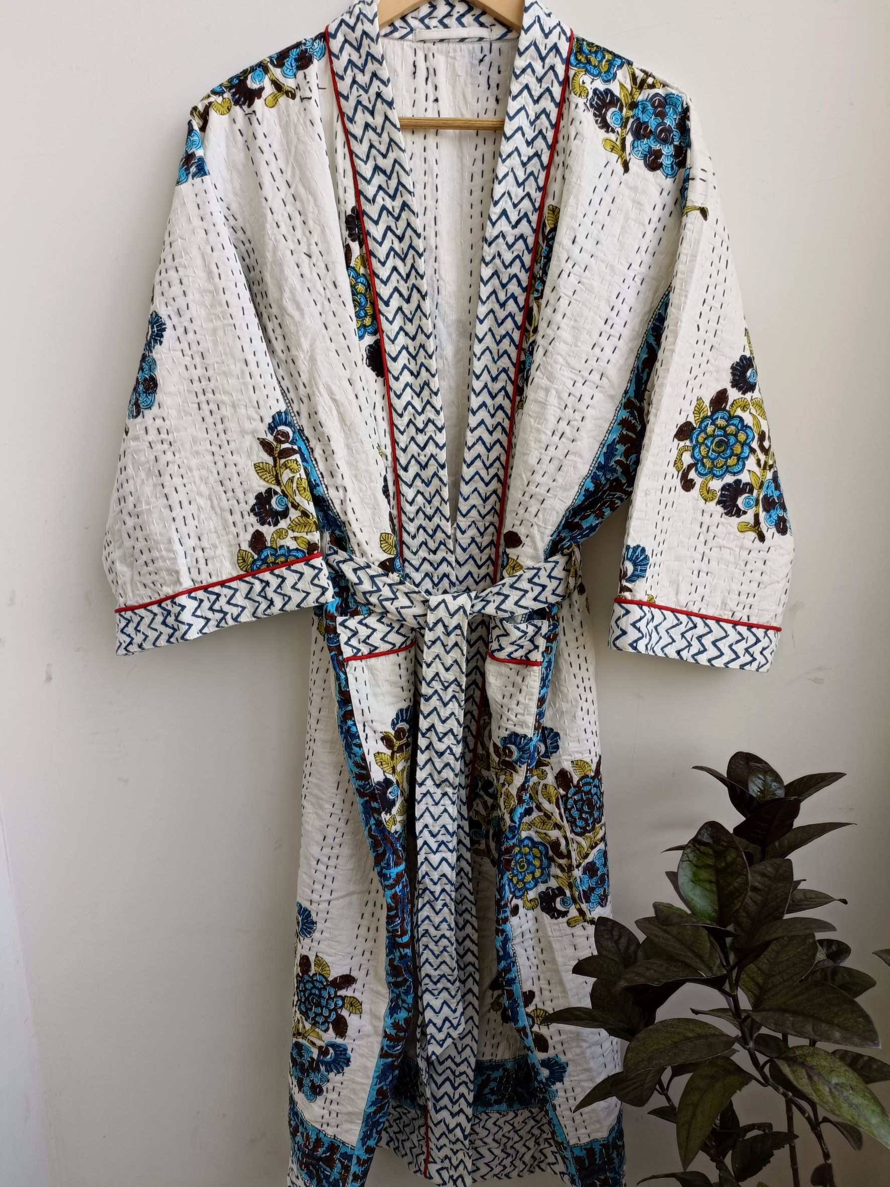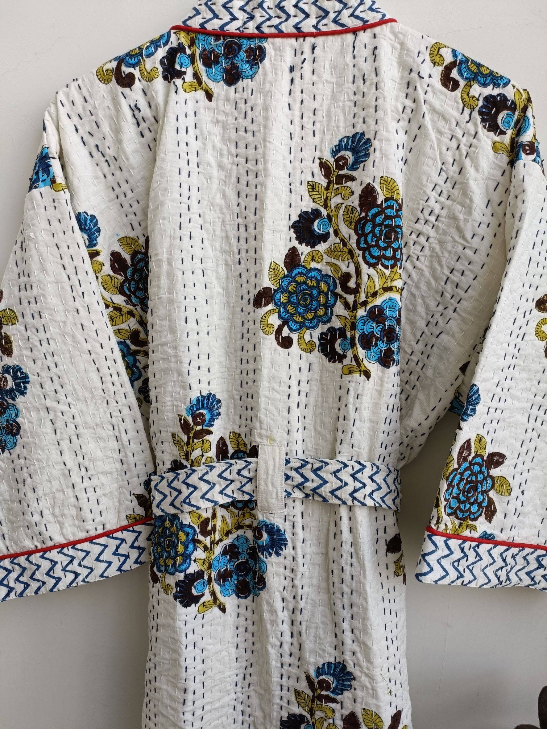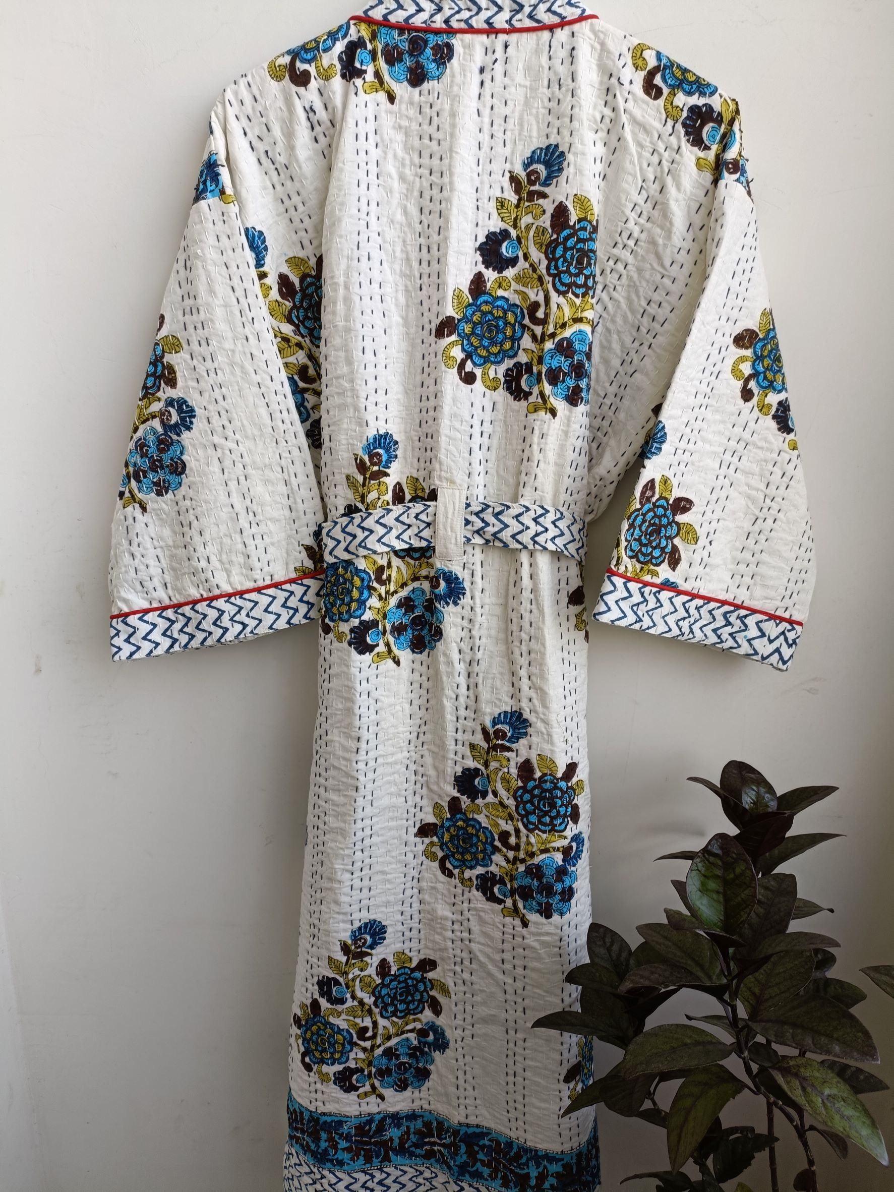 Premium Quality 100 Percent Cotton Kantha White Color Kimono Robe Coverups Bath Robes Wrap Dress for Women From India