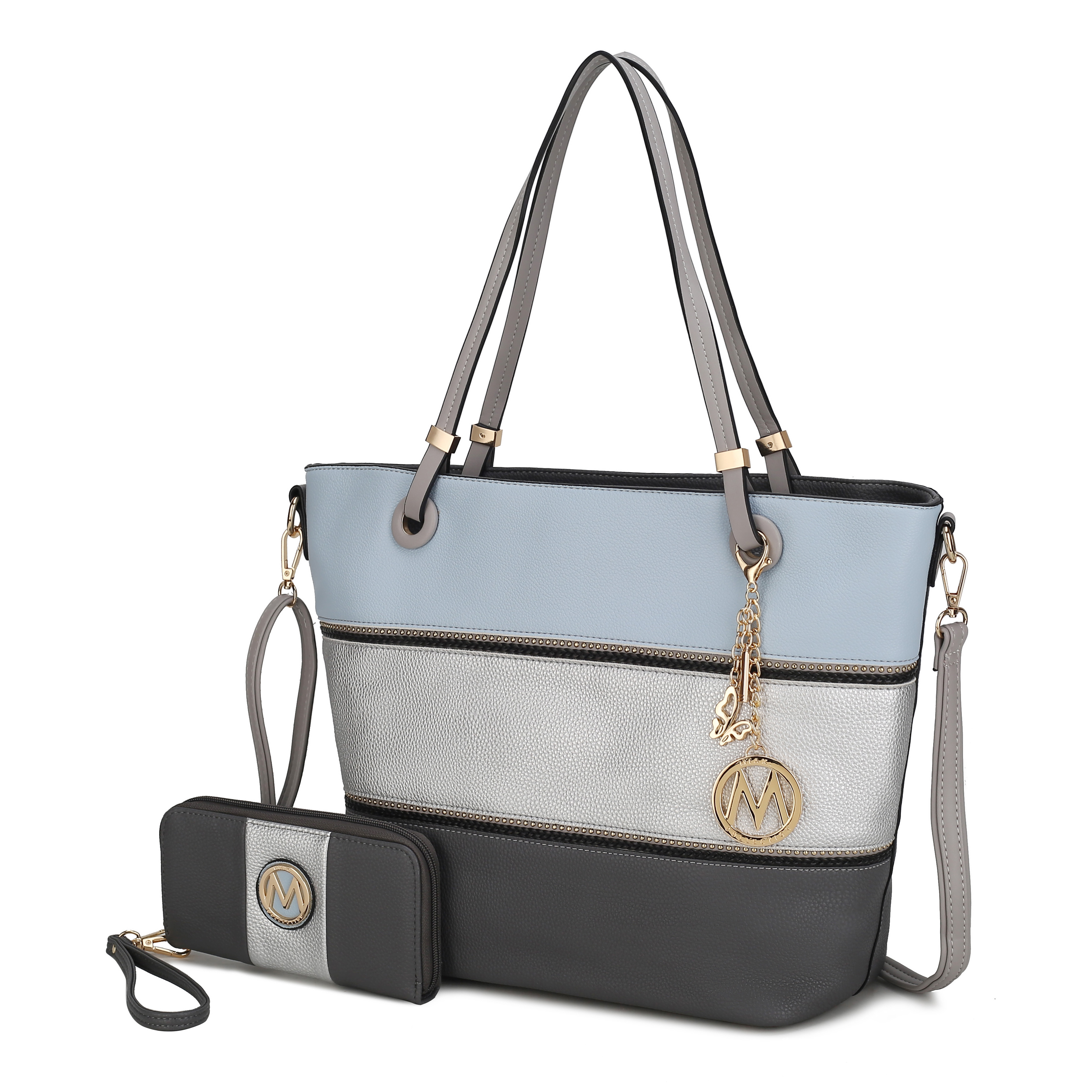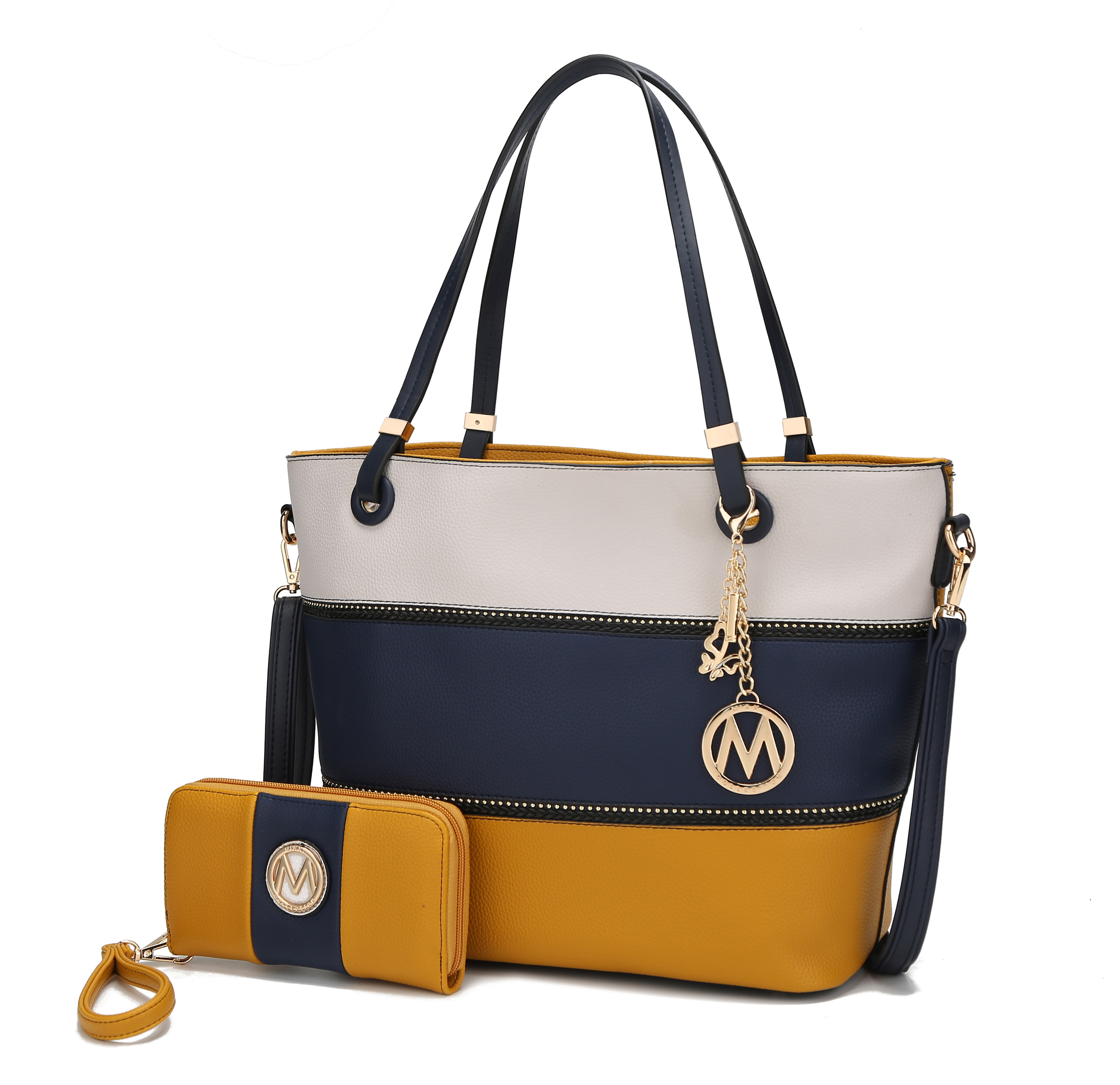 •Our Vallie carryall is the ultimate Tote bag for everyday wear. Crafted from color-block high-quality pebble vegan leather and designed with luxurious gold-tone embellishments, this softly structured bag will become your favorite everyday essential. Unzips the Vallie Tote Bag to reveal a fully lined interior with two slip pockets and a wall zippered pocket with room for everything you will need. The spacious design is complete with a padded center zip compartment. The exterior features a convenient back zippered pocket. The Vallie Tote Bag has a flat base and metal feet to keep the bag upright position. You can carry this versatile style on your shoulder by the top handle or attach the removable and adjustable strap and style it crossbody for hands-free ease. The Vallie Tote Bag has accented with our signature Mia K. Collection emblem keychain for decoration, and it comes with a matching wallet.