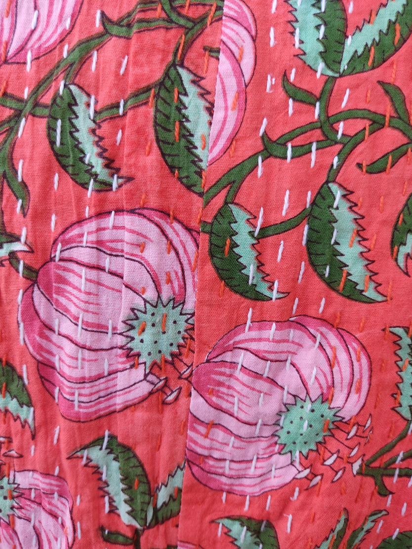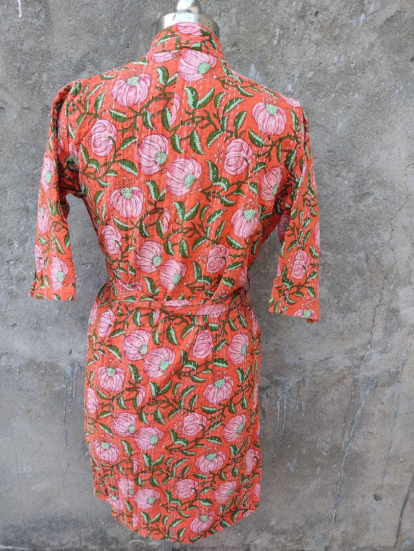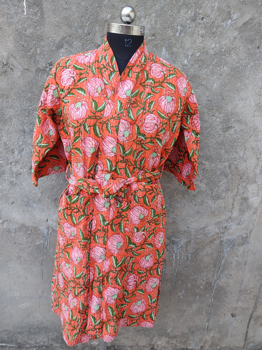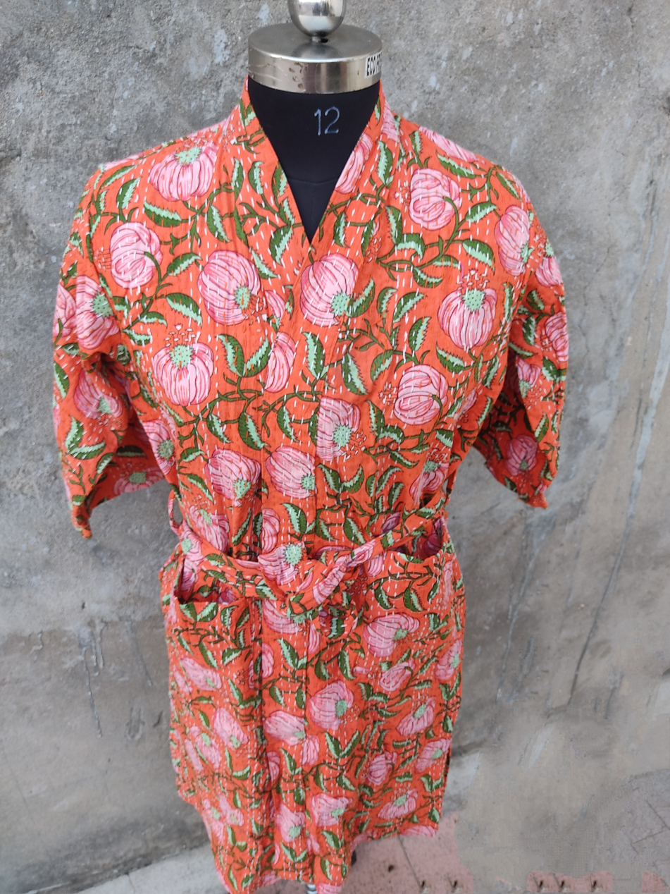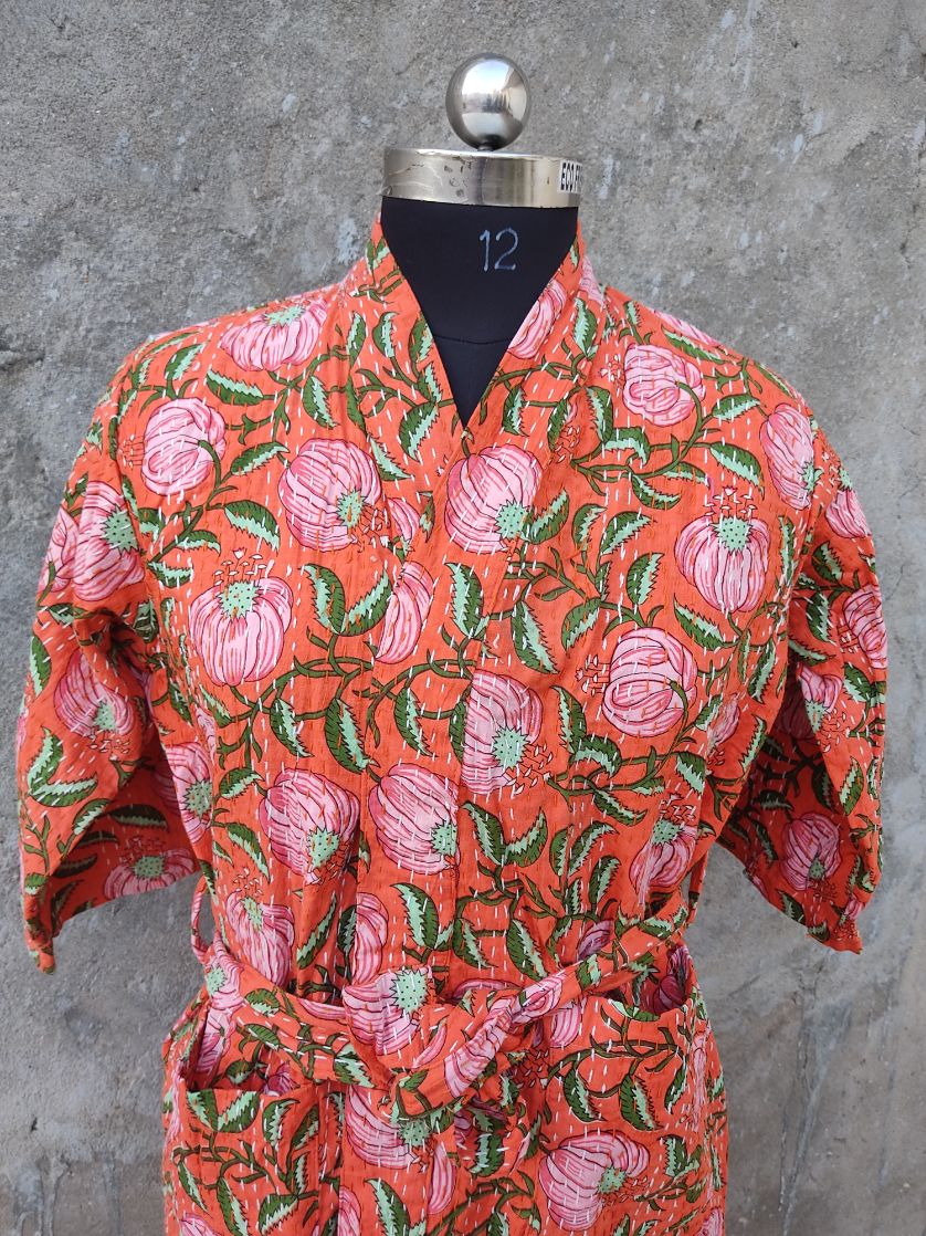 Orange Kantha Bath Robe Plush Size Women Cotton Robes High Quality Lined Kantha Handmade Robes, Women Sleepwear