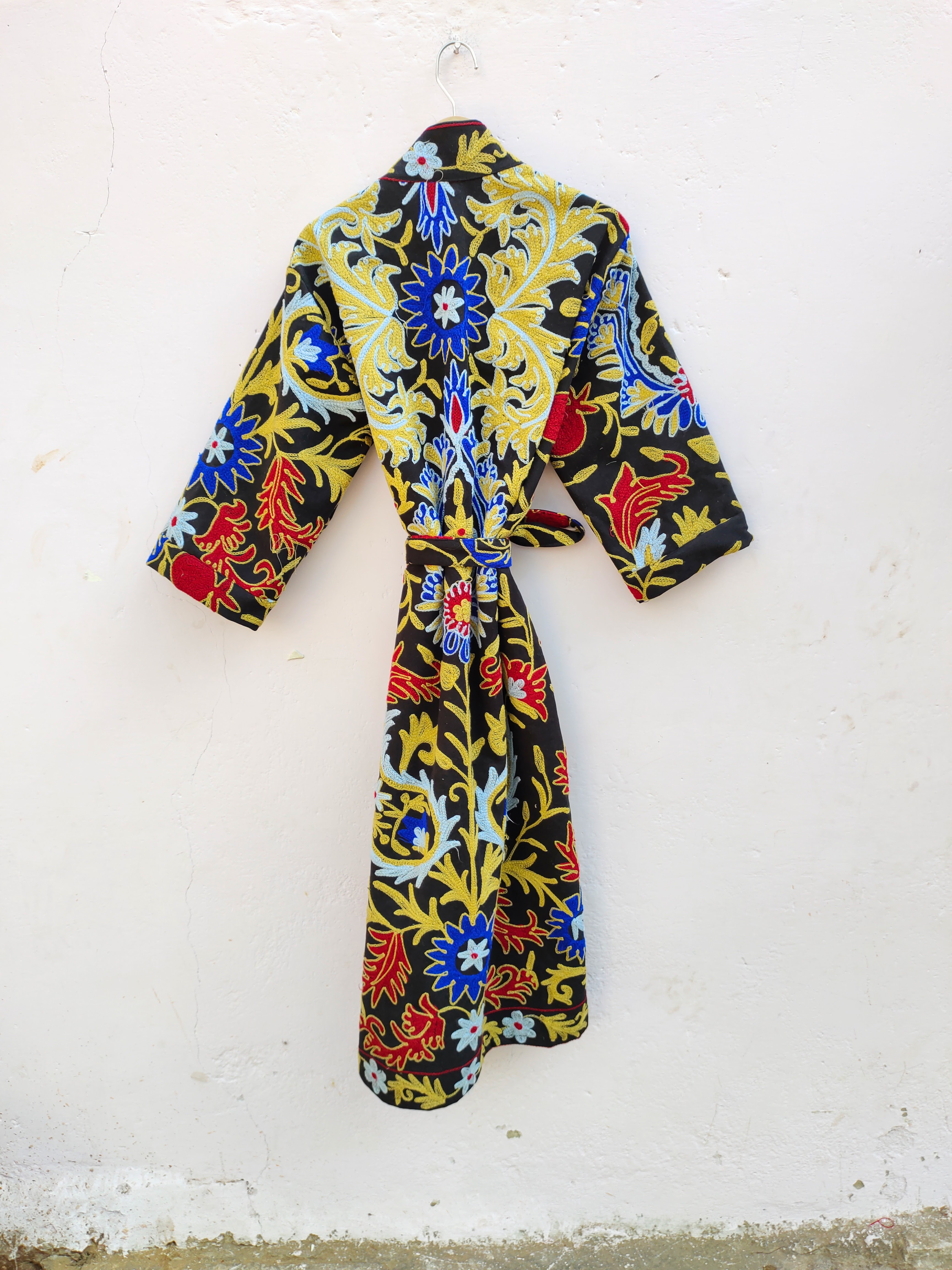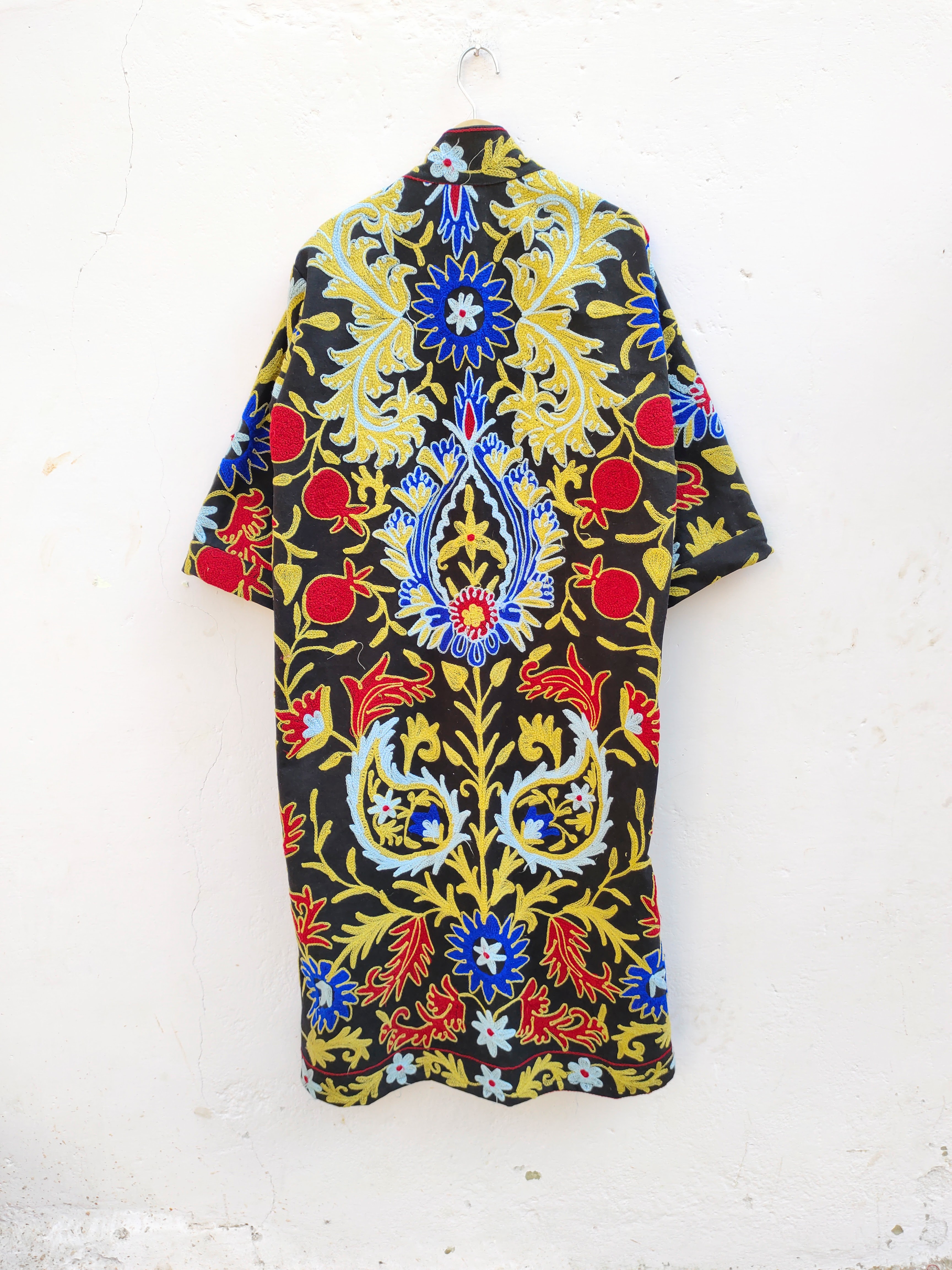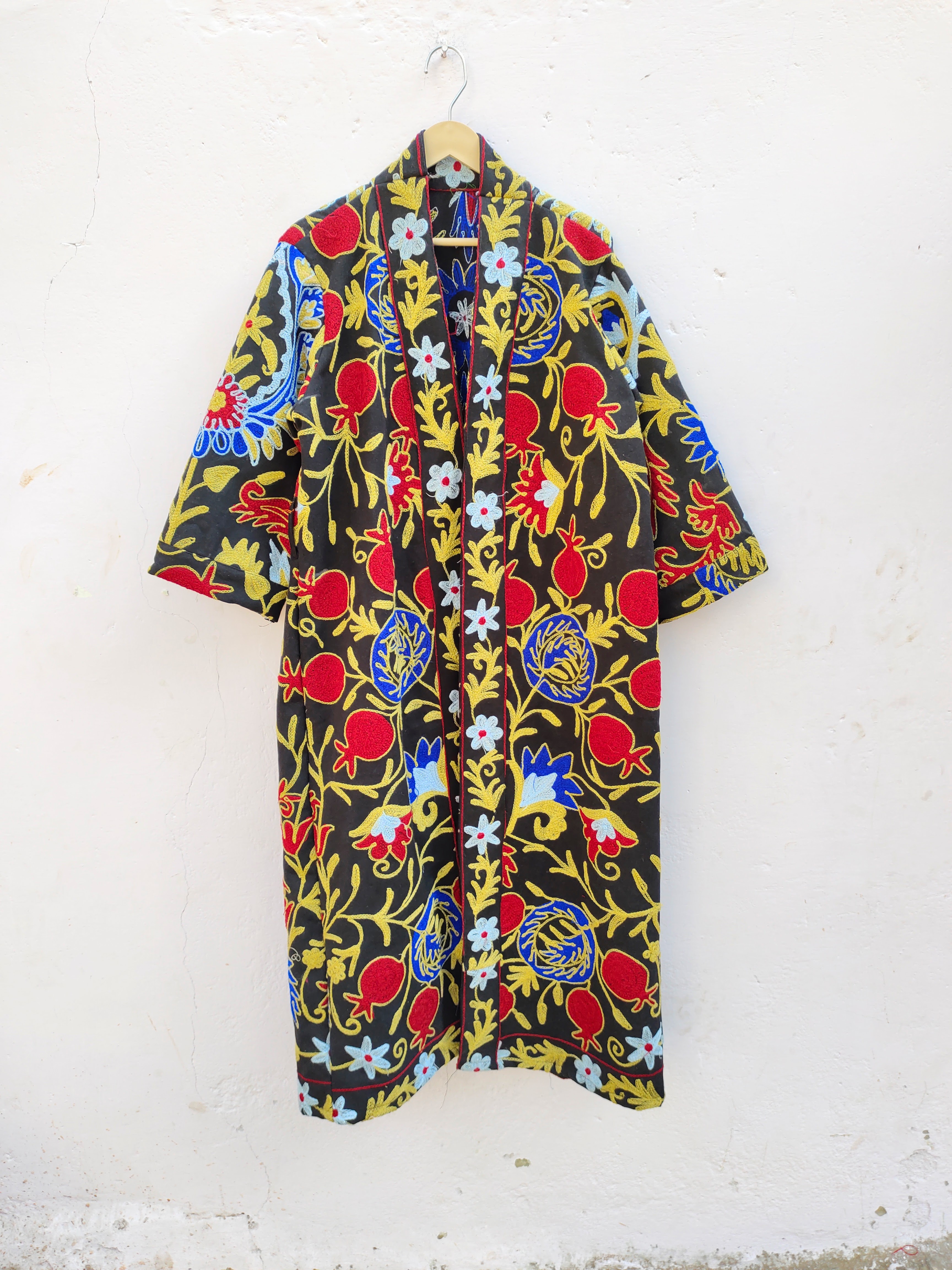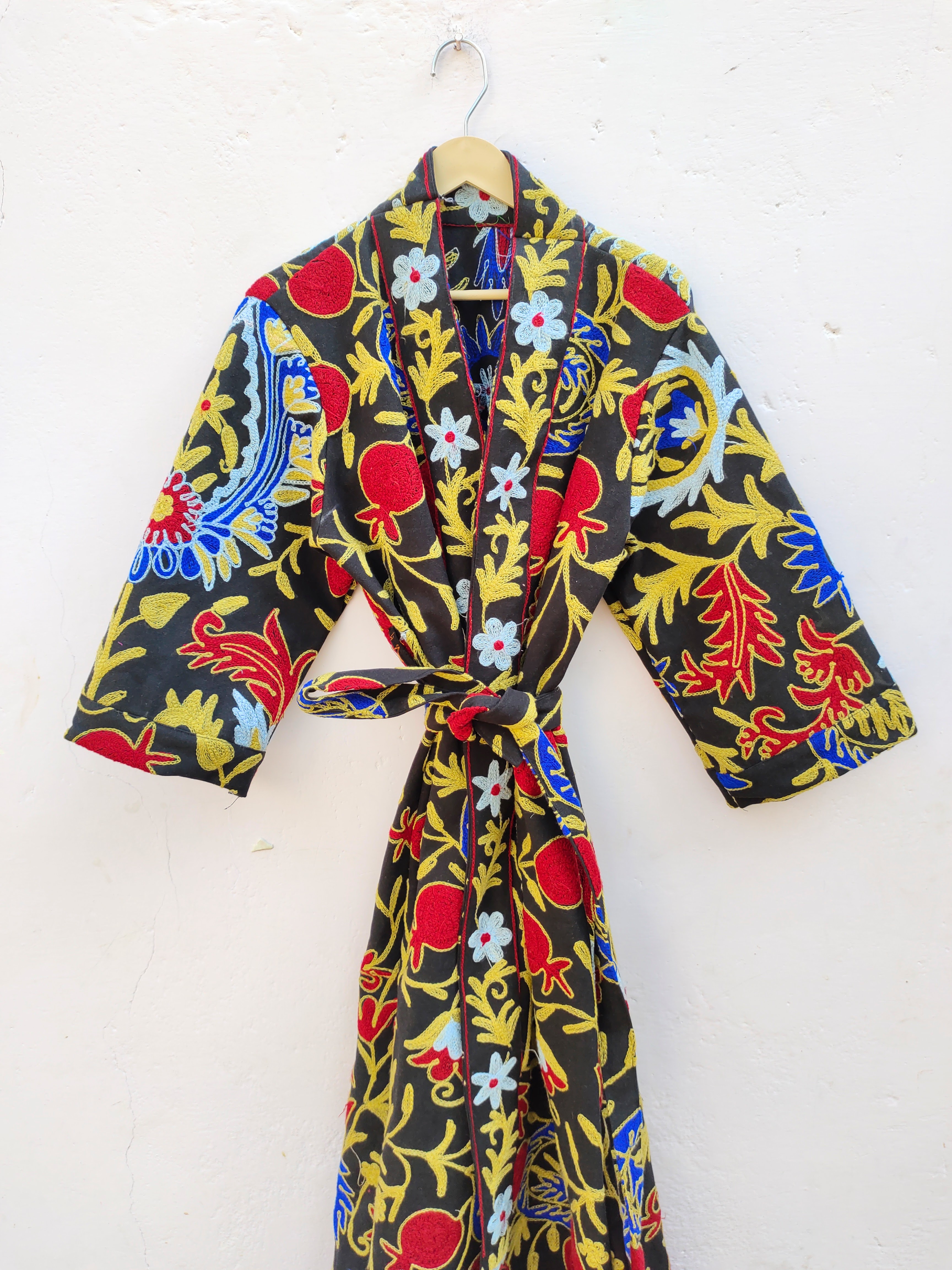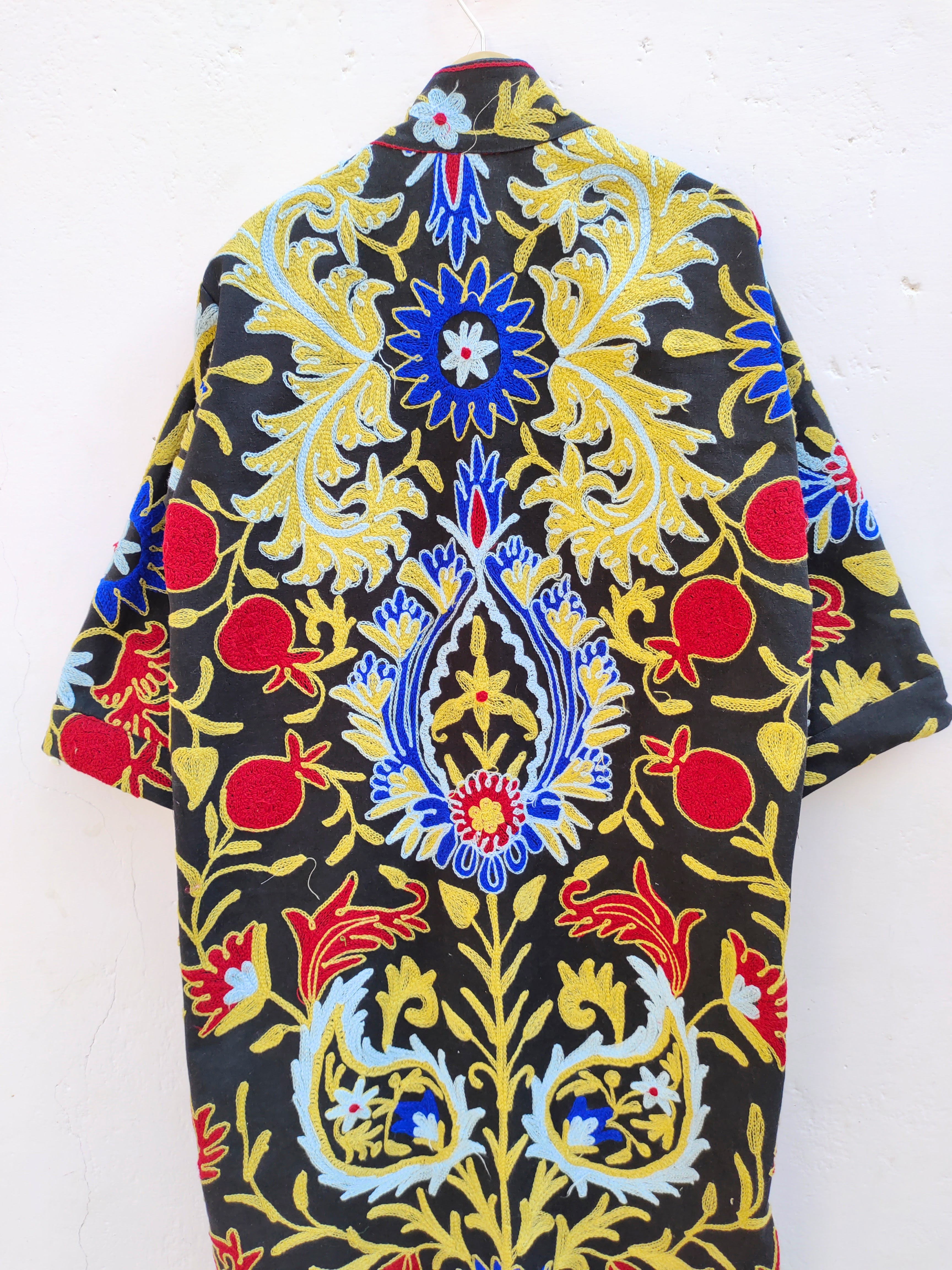 Classic Elegant Women's Suzani Hand-Embroidered Jacket Boho Crewel Black Multi-Color Home Sleepwear Summer Season Special Gift