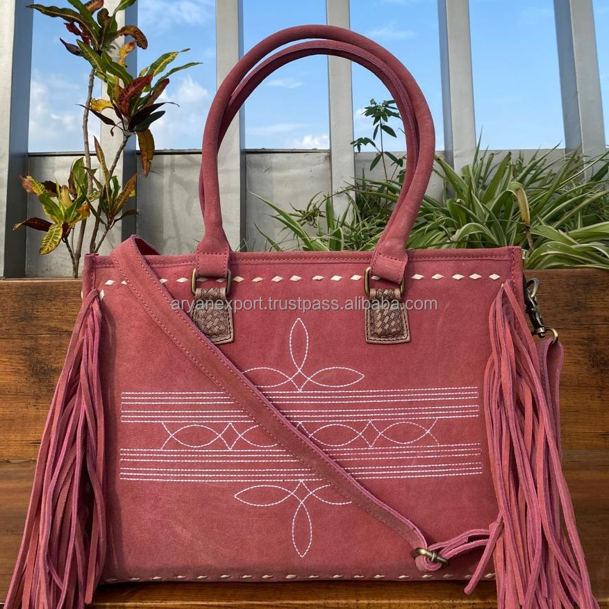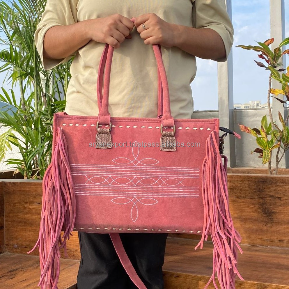 2024 New Boot Stitch Pink Suede Leather Fringe Tote Bag for Women's Western Concealed Carry Genuine Leather Crossbody Handbags
