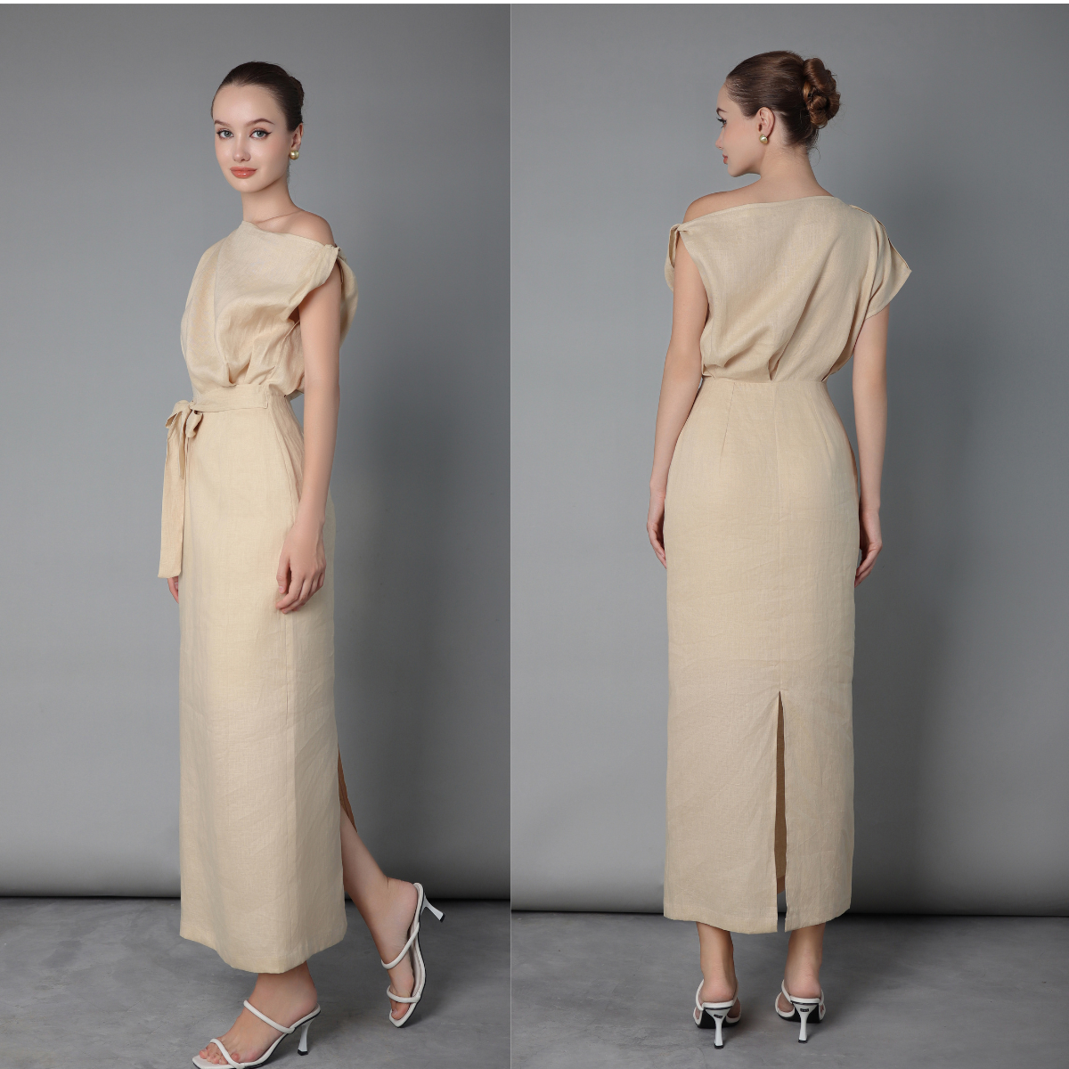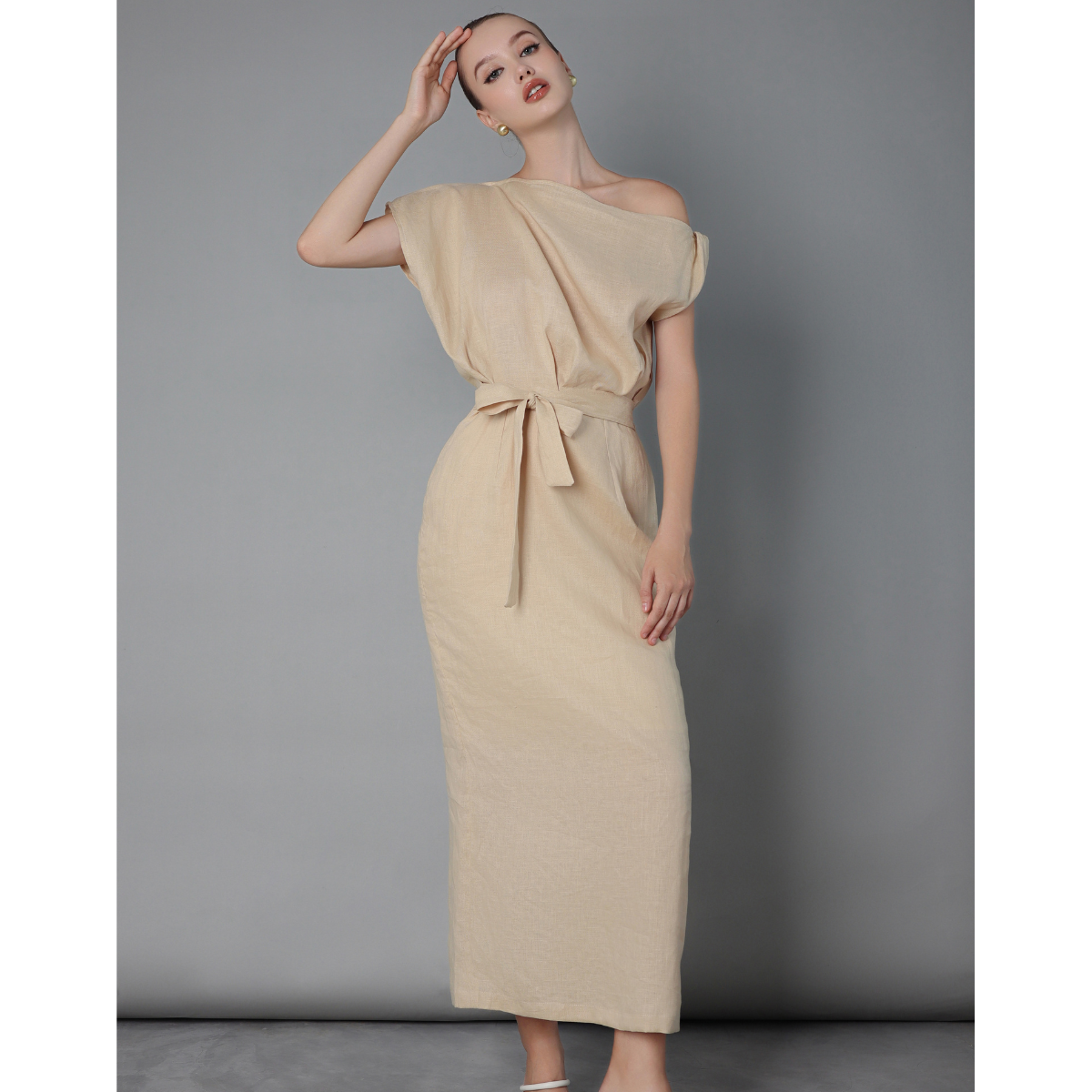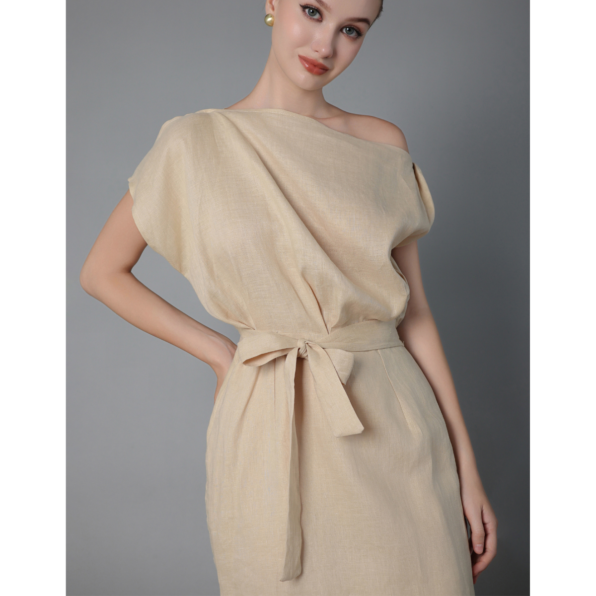 Dress Women 100% Linen Dress Clothes Natural for Women Wholesale OEM ODM Off Shoulder Midi Fashionable Vietnam High Quality