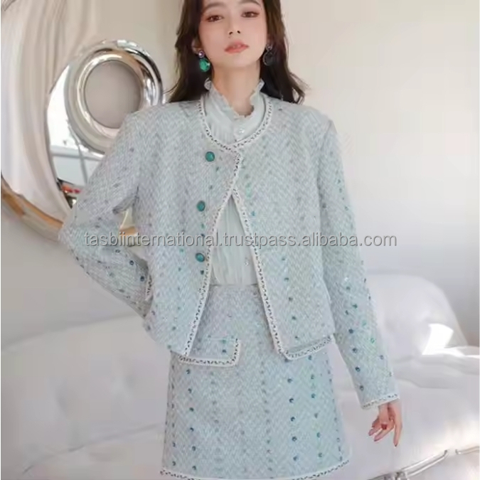 Spring New Luxury Sequin Embroidery Ladies Office Wear Skirt Suit Women Two Pcs Skirt Cotton Women's Sets