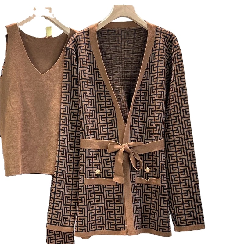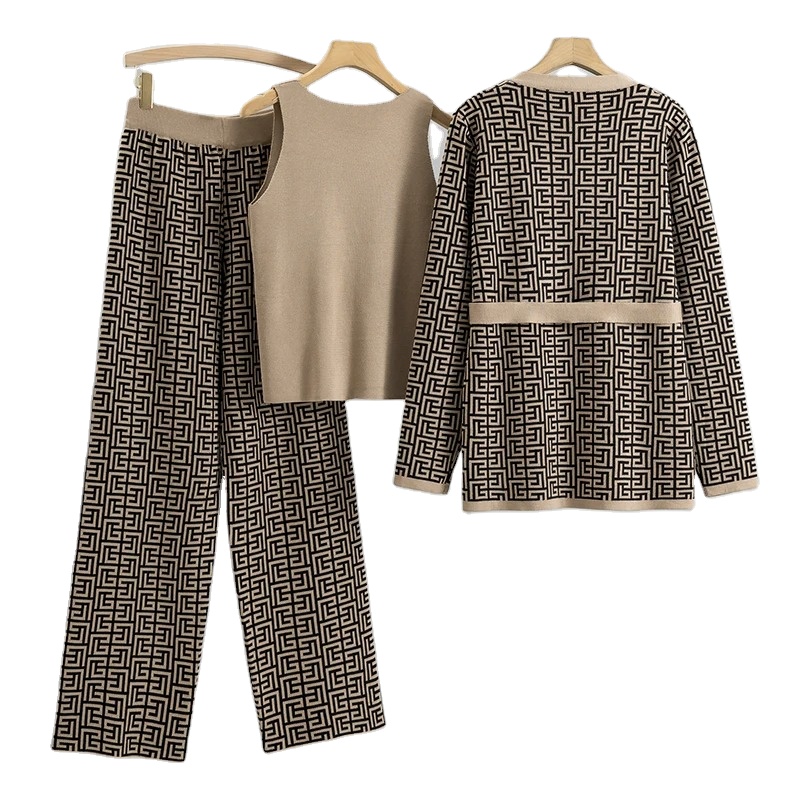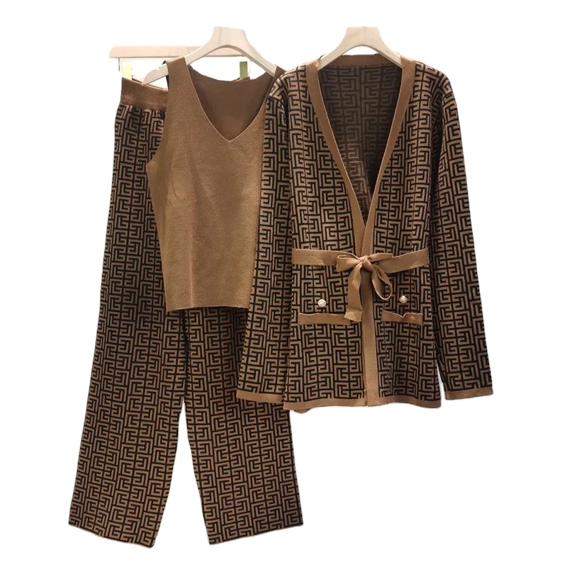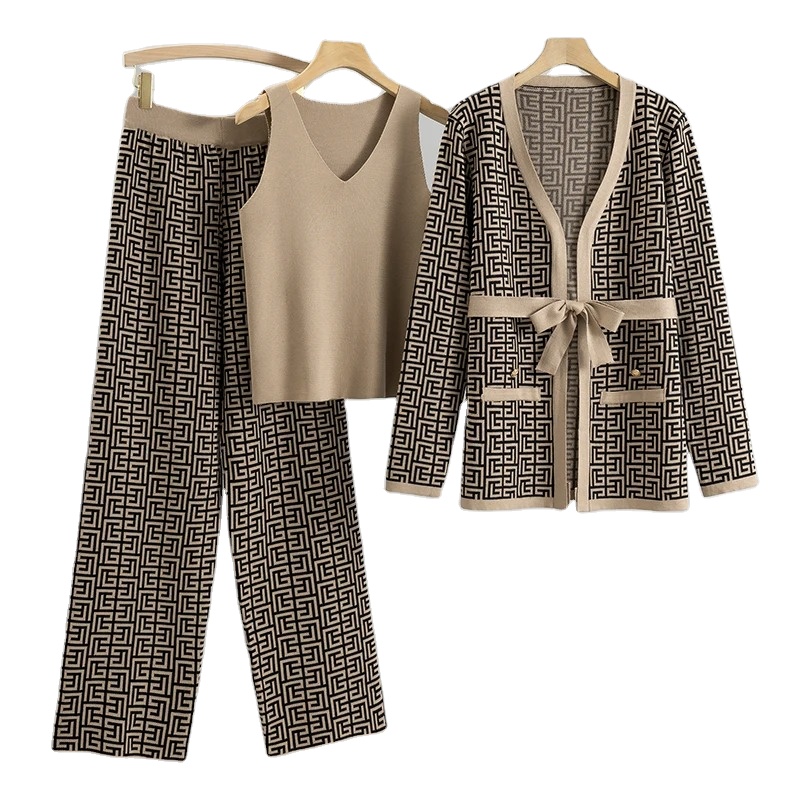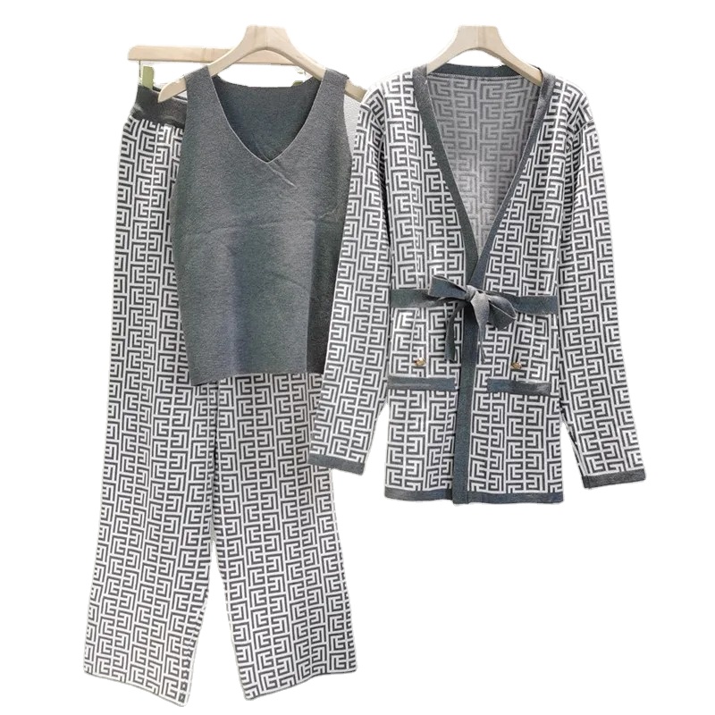 Spring Autumn 3 Piece Women Cardigan Tracksuits Sexy Vest Long Sleeve Shawl Cardigan Coat Wide Leg Pant Women's Knitted Suit
