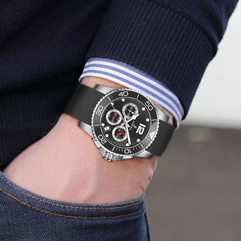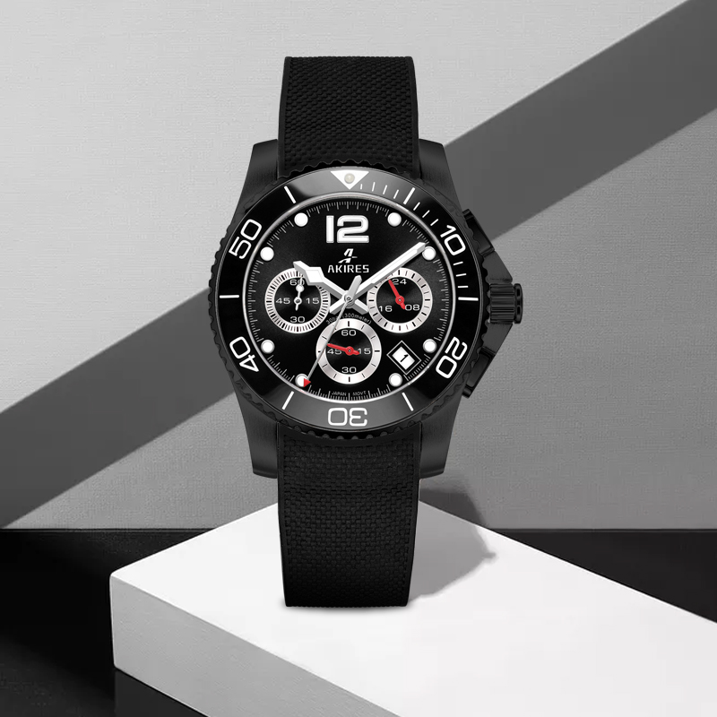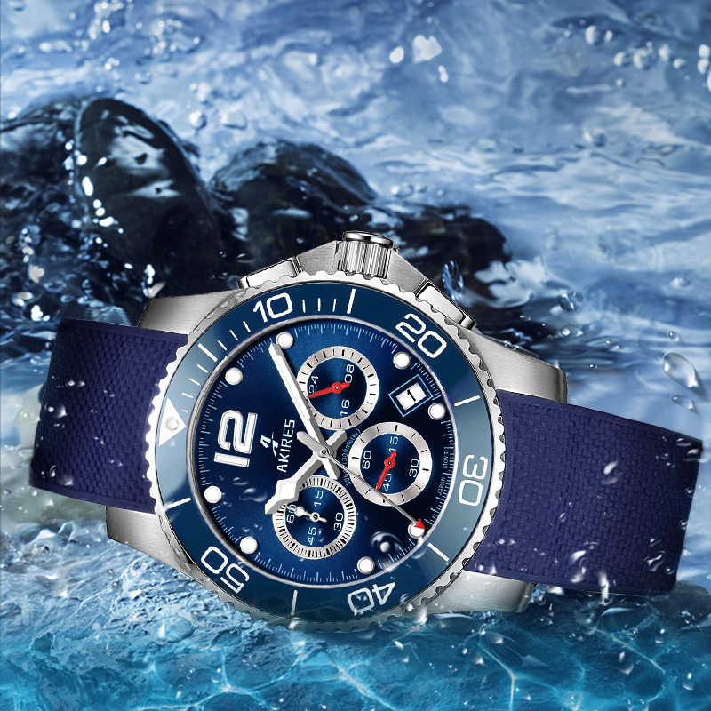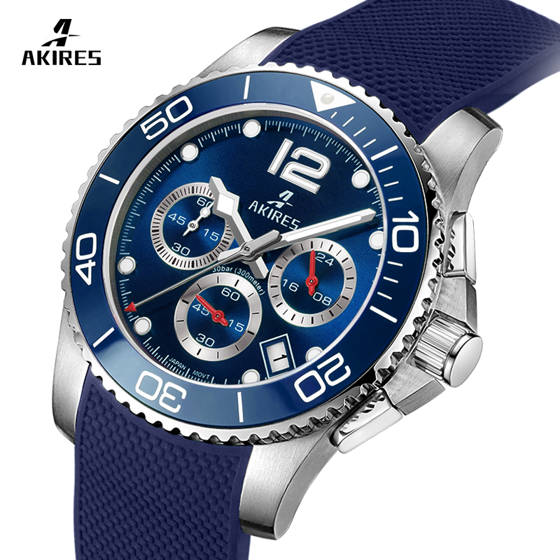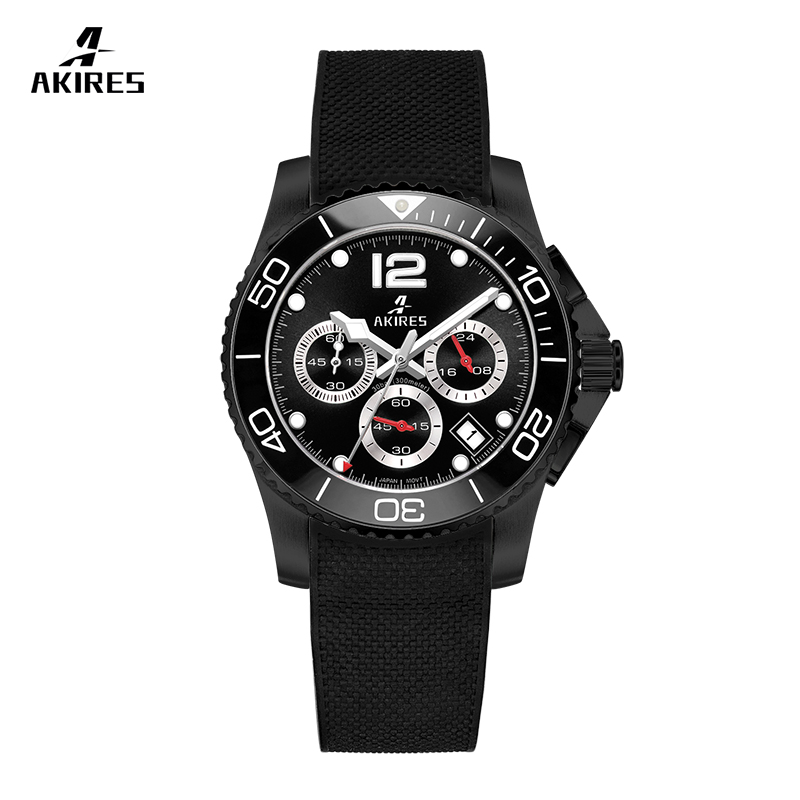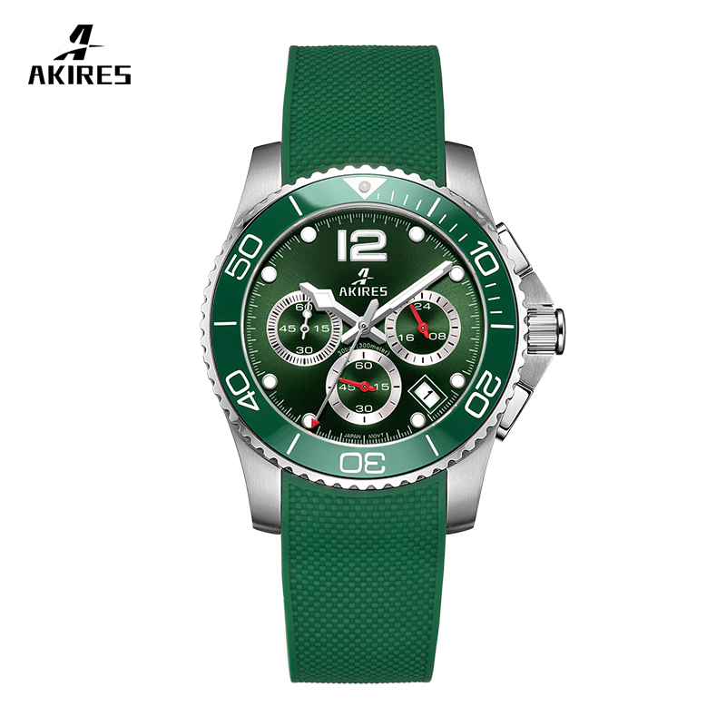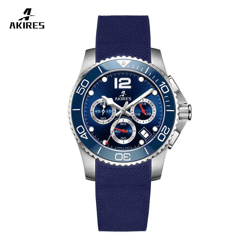 Material: | Brand : AKIRES Or Custom logo available Movement : VK63 chronograph movement Dial Diameter: 41.2mm Case Thickness : 11.8mm Band Width : 21mm *18mm Case Material: 316L stainless steel /904L SS available for 300pcs Glass Material : Sapphire glass Band Material : stainless steel/Silicone strap available Waterproof : 20ATM |