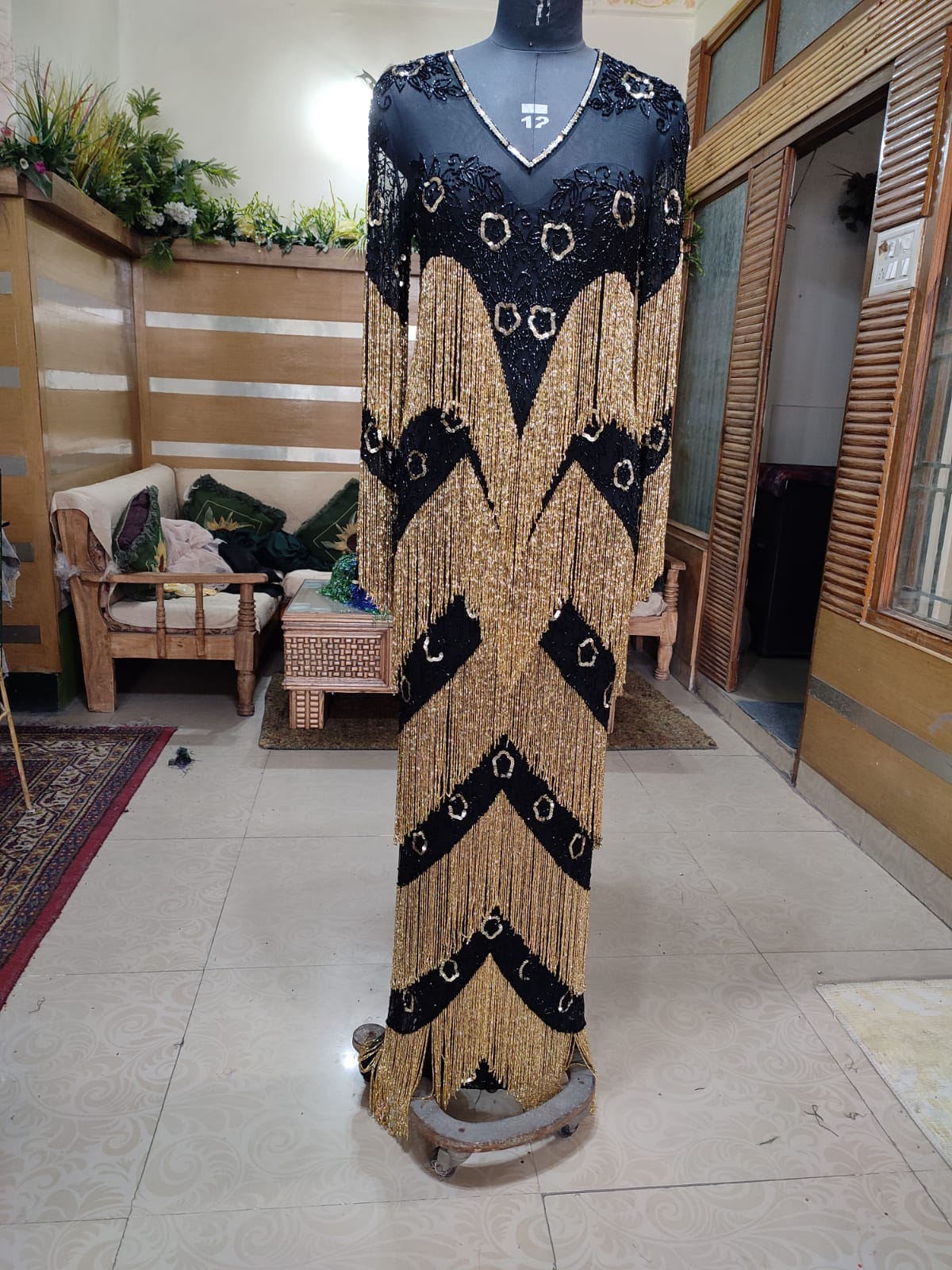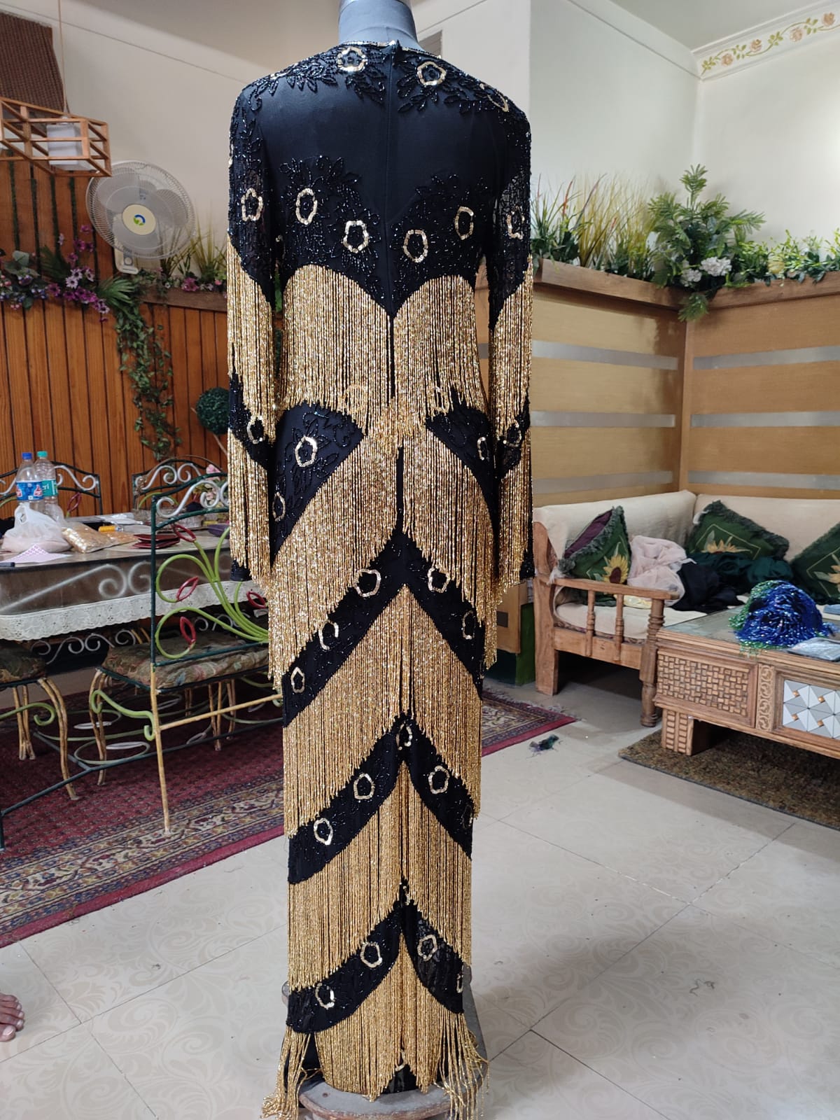 Description | Pretty Antique gold hand embroidery with handbeaded antiqe fringes |