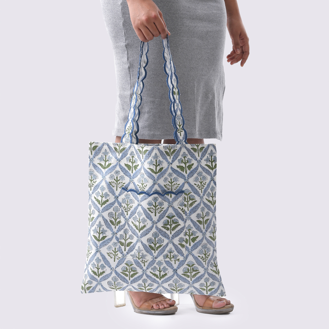 Trending New Light Steel Blue Indian Floral Block Printed Canvas Women's Aesthetic Bag for Grocery Shopping School Church