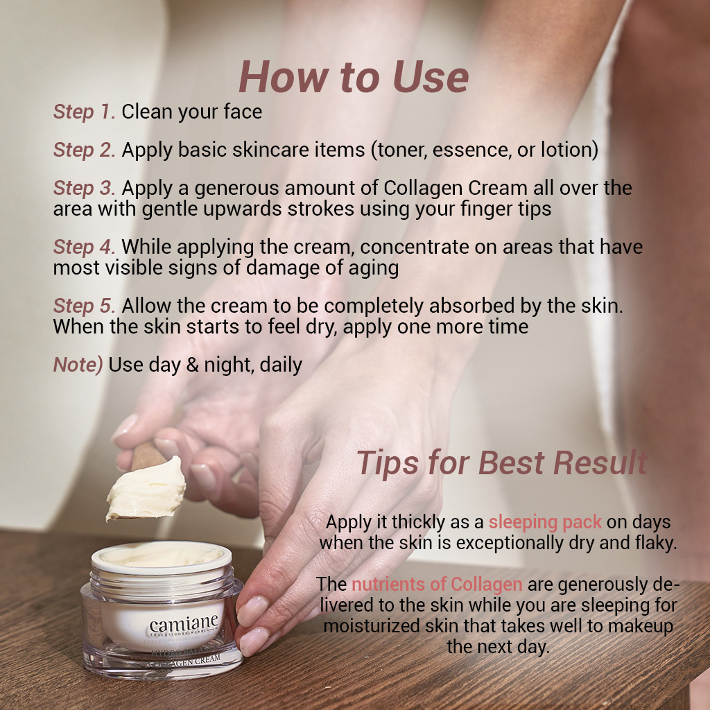 - The nutrients from Collagen Cream are generously delivered to the skin while you are sleeping for a moisturized skin that takes well to make up the next day.