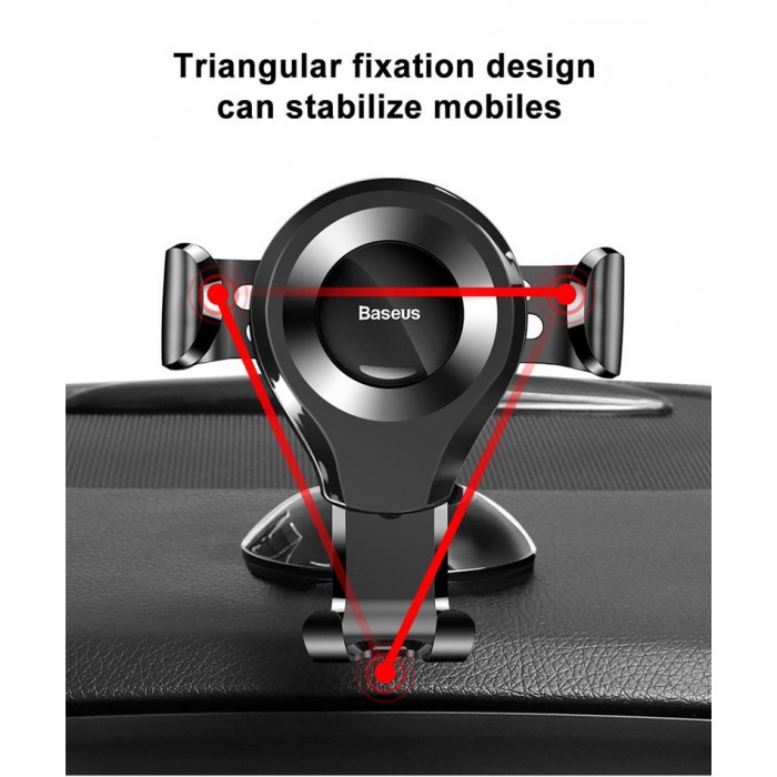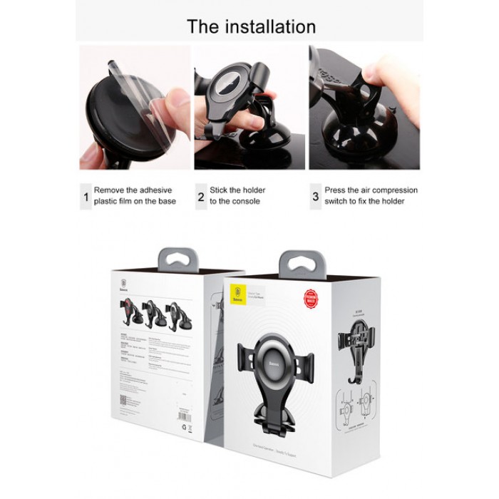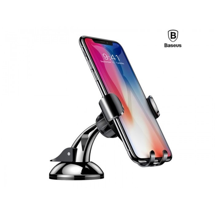 The Baseus Gravity Osculum Suction Cup Car Mount Holder for mobile phones features a convenient automatic arm-lock system with a secure adjustable cradle and the option to fix to your windshield or dashboard. Available in a Black with Silver accent.