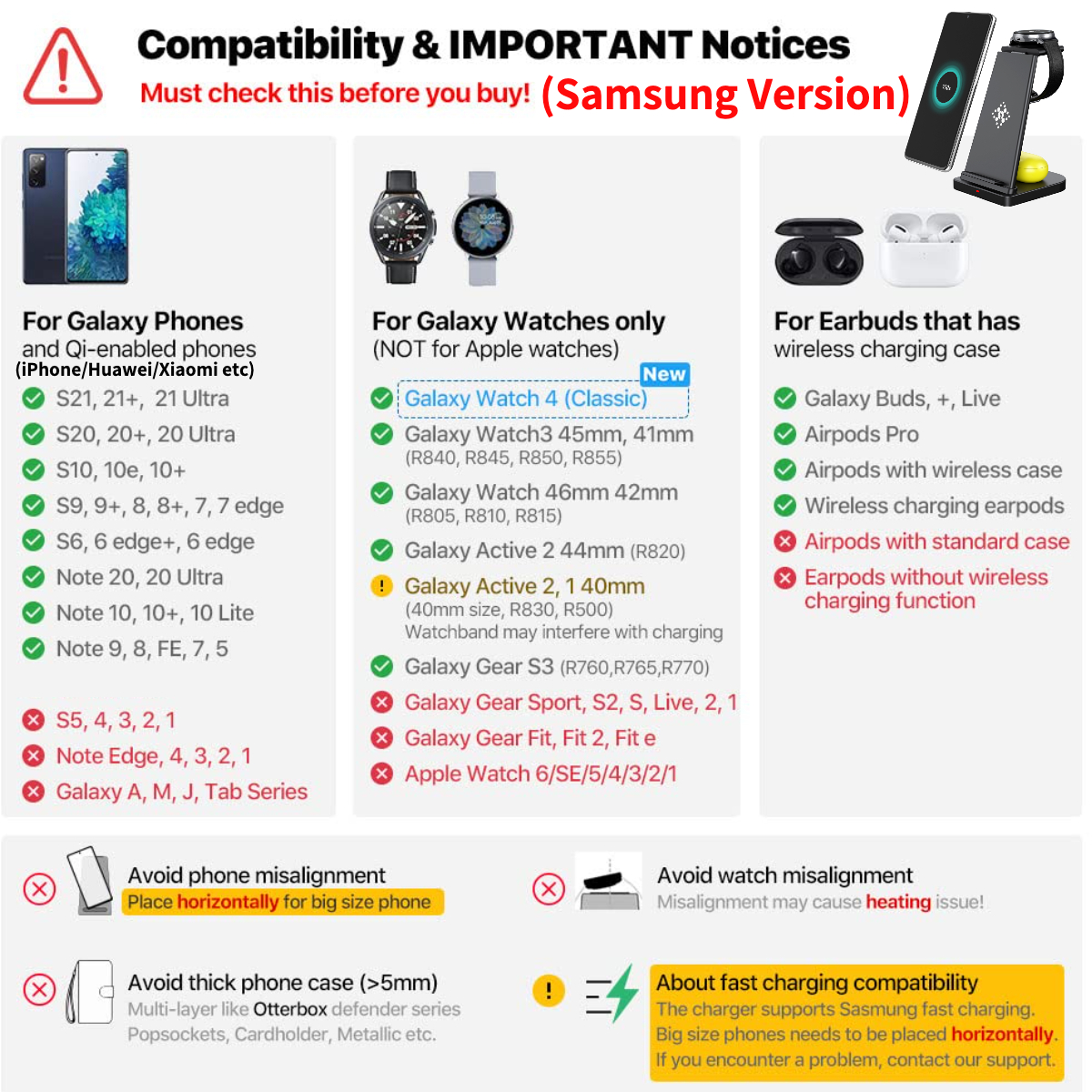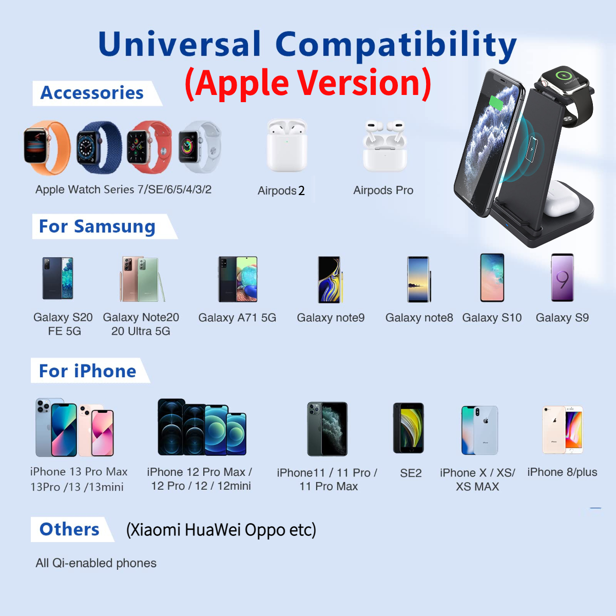 Product Description :【WIDE COMPATIBILITY】 Both Samsung and iPhone Version works for all Qi Enable Wireless Phones.- iPhone Version (ALL iWatch/Airpod/iPhone and Qi-Enabled Wireless Smart Phones. )- Samsung Version (ALL Samsung Watch/Samsung Earpod/Android Phone and Qi-Enabled Wireless Smart Phones. )【3 IN 1 WIRELESS CHARGER】 2021 new version wireless charger stand for fast charging your Qi-Enabled Phones, Apple Watch, AirPods wirelessly at the same time, no need to worry about the various charging cables in your life, making your desk tidy and cool! Never overheats your devices, brings you endless enjoyment and convenience! 【Qi-certified AND NO WORRY CHARGING】The charger station uses the most advanced automatic control technology. Equipped with various functions, such as overcurrent, overcharge, overvoltage, overheat, etc. and temperature control function, automatic switch-off, foreign matter and metal object identification, etc. Flashes quickly to ensure your smartphone stable charging, so you can experience wireless charging with total peace of mind【COMPACT DESIGN & OPTIONAL CHARGING ANGLE】Slip the 3 in 1 Wireless Charger into your laptop bag or backpack so you have it anywhere you need it; Qi-enabled Phones can be charged both vertically and horizontally, watching movies, listening to music, making calls or sending a message without interruption during the whole charging process.【 Simple & Easy installation】The product is tolerant fit please do the attached two parts device firmly before using it. Improper installation may cause the watch and phone not to charge. Anything technical issues please do contact our chat for help. - Input Voltage: 9V-2A - Wireless Output for Phone: 5W/7.5W/10W/15W Max - Wireless Output for Earphone: 5W Max - Wireless Output for Watch: 2W Max - Material: ABS+PC Fireproof Material - USB Cable Length 1M- DO USE A 15W/QC ADAPTOR TO ENJOY FAST CHARGING EXPERIENCES.(As a normal charger only having 5W will slow down the overall charging speed)What's in the package?- 1x 3-IN-1 Charging Dock- 1x USB CABLE3 Months Local Warranty*Terms and conditions applied *