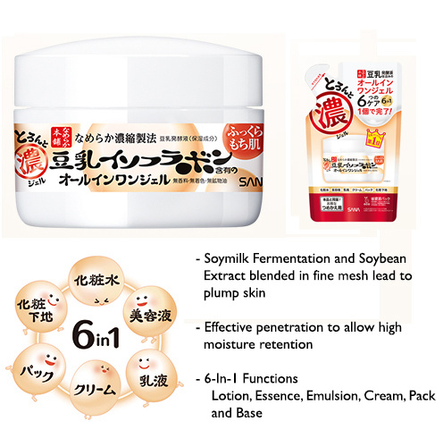 Japans No. 1 Brand for Soya Skin Care Series! Jelly-like and thick texture is similar to concentrated soymilk. Includes soymilk fermented liquid which fully contains isoflavone. Jelly extra moisture gel melts at skin temperature and permeates easily to the skin. It is a perfect skincare with 6 in 1 function - skin toner, serum, emulsion, cream, mask & makeup primer. Direction: Spread on entire face with generous amount.