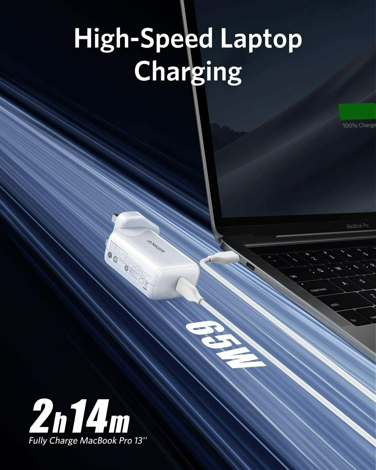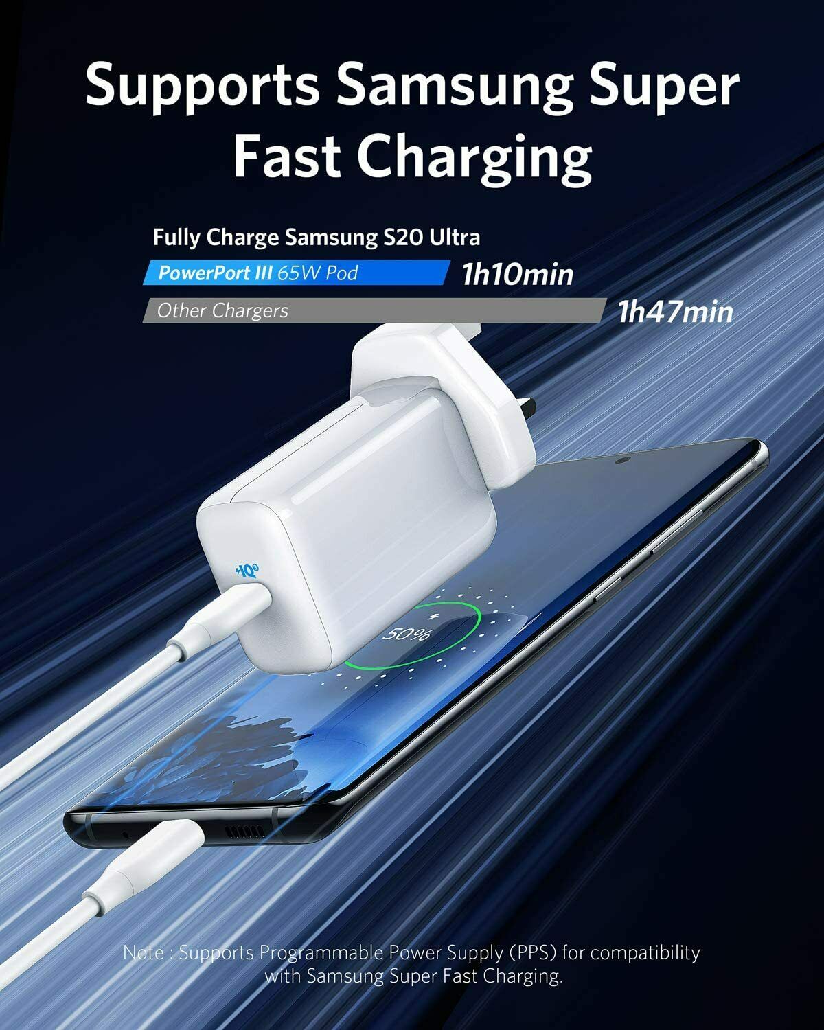 Anker 65W PIQ 3.0 PPS Fast Charger, PowerPort III Pod, for iPhone 14/14 Plus/14 Pro/14 ProMax/13 Series/12 Series/11 series /Xs/X,MacBook, Dell XPS 13, Galaxy S20 / S10, Note 10+ /10, iPad Pro, Pixel, and More