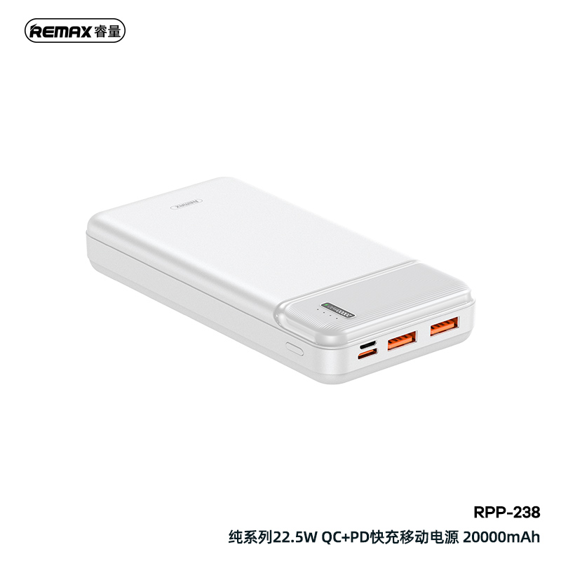 Remax 20,000mAh PD QC 22.5WCapacity: 20,000MahDimension:13 X 7 X 2.5 cmCurrent: up to 4.5A Fast chargingModel: RP-238Battery Indicator: 4 LED lightsInput: Micro USB, Type COutput: USB X 2, Type CColours: Black, WhiteWeight: ~460gram per power bank