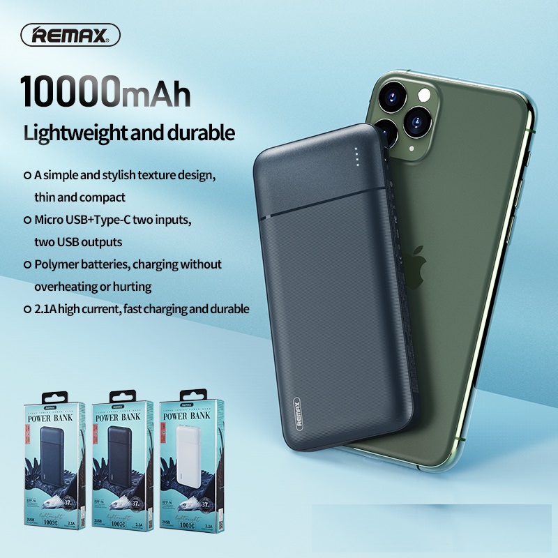 Remax 10,000mAh Light weight Power Bank RPP96Capacity: 10,000MahDimension:14 X 7 X 1.5 cmCurrent: 2.1A Fast chargingModel: RPP-96Battery Indicator: 4 lightsInput: Micro USB, Type COutput: USB X 2Colours: Black, WhiteWeight: ~200gram