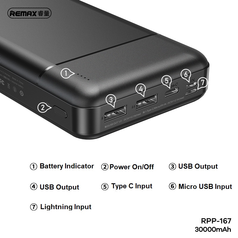 Capacity: 30,000MahDimension:16cm X 8cm X 3 cmCurrent: 2.1A Fast chargingModel: RPP-167Battery Indicator: 4 LED lightsInput: Micro USB, Type COutput: USB X 2Colours: Black, WhiteWeight: ~620gram per power bank