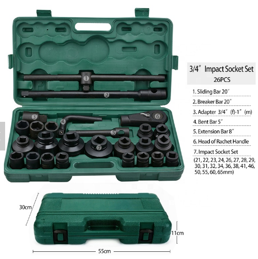 * 17 x 3/4" Metric sockets(21,22,23,24,26,27,28,29,30,31,32,34,36,38,41,46,50mm) |