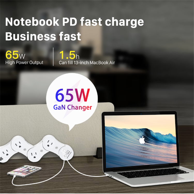2, 65w Gan Adapter: Intelligent circuitry with built-in voltage sensing detects and responds to your device's power needs, can charge your Cellphone, iPhone, MacBook, and laptop directly without other adapters.