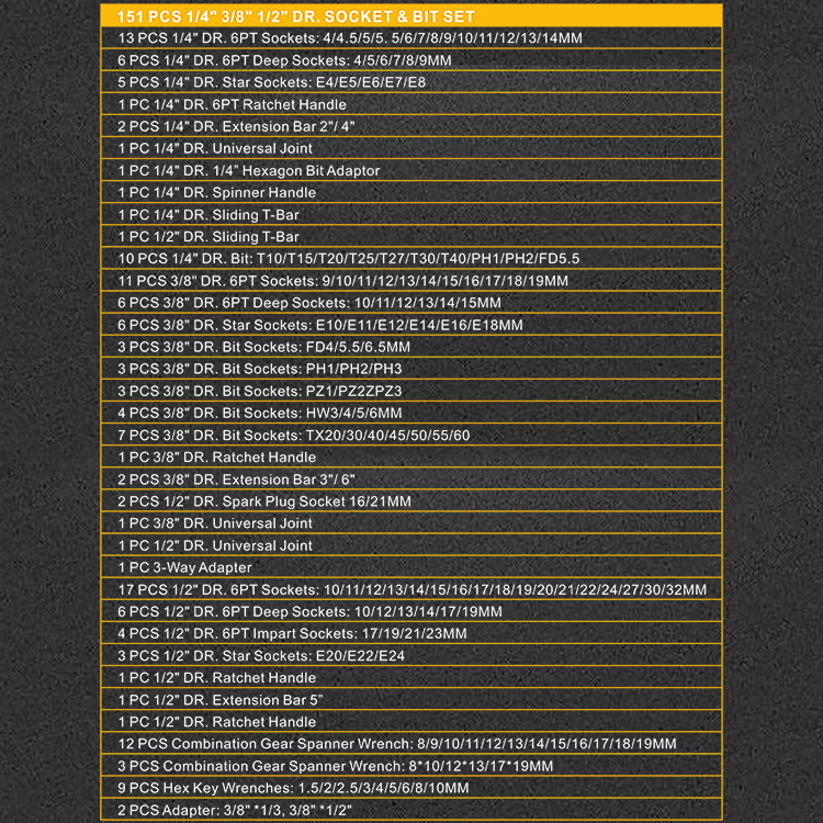 11pcs 3/8" DR. Socket: 9/10/11/12/13/14/15/16/17/18/19mm |