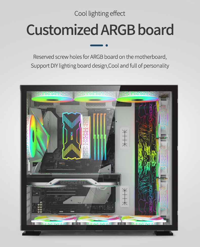 Fan positions : | Front:3*12CM cooling fan or 240mm water cooler ; Top:3*12CM cooling fan or 2*14CM cooling fan or 360mm water cooler or 280mm water cooler or 240mm water cooler ; Rear:1*12CM cooling fan or 120mm water cooler+2*8CM cooling fan; Buttom:3*12CM cooling fan ; |