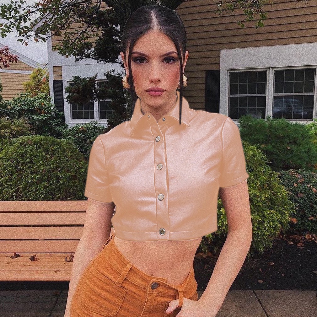 Black PU Leather Button Up Short Sleeve Crop Top T Shirt Women Fashion 2021 Streetwear Vintage Clothes