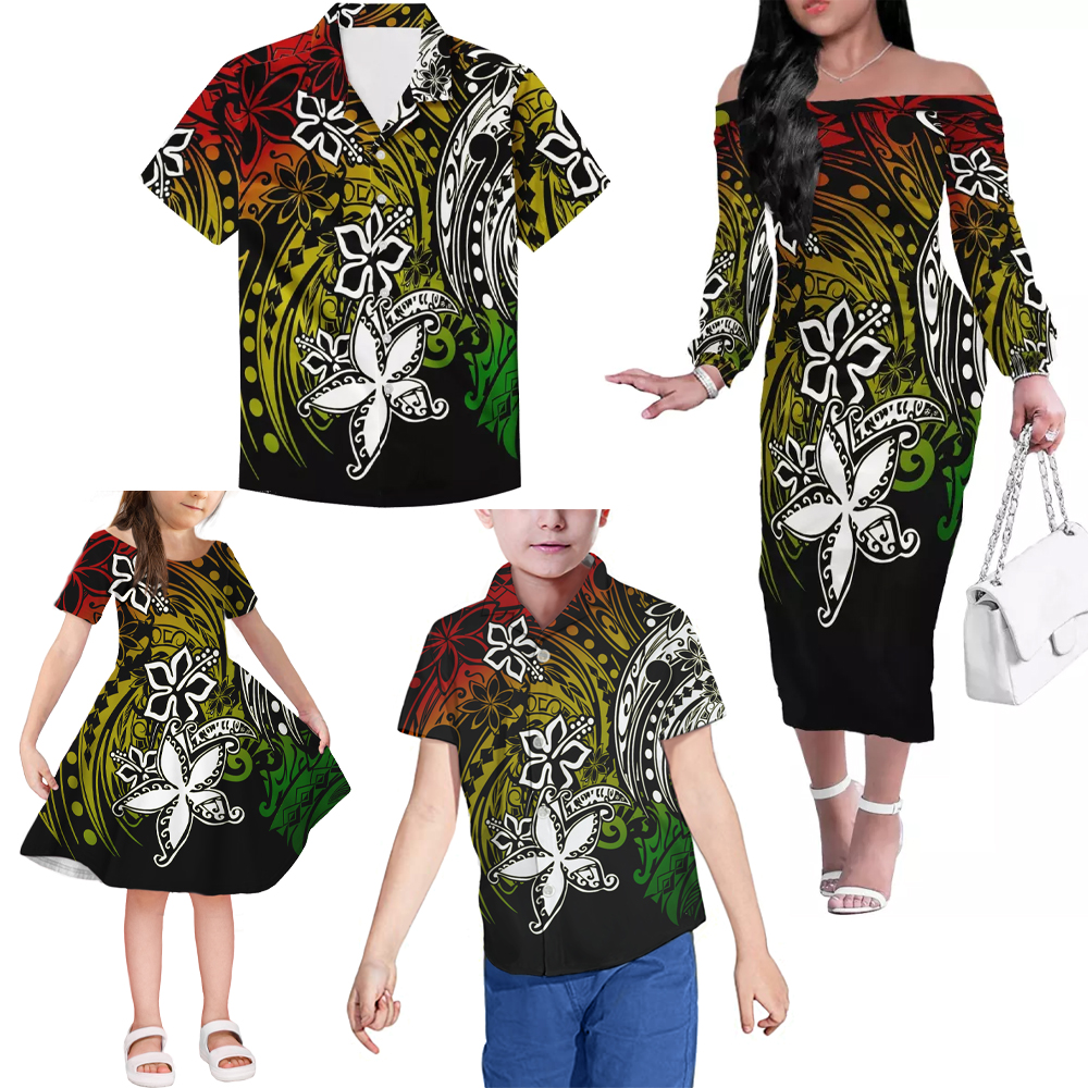 High Quality Women's Girl Off Shoulder Dress Family Set Polynesian Tribal Style Plus Size Girl Long Sleeve Dress and Men Shirt