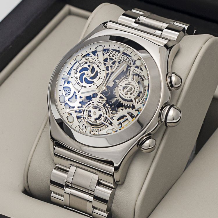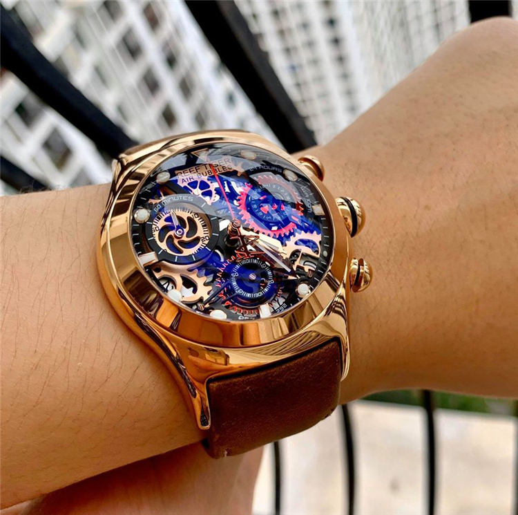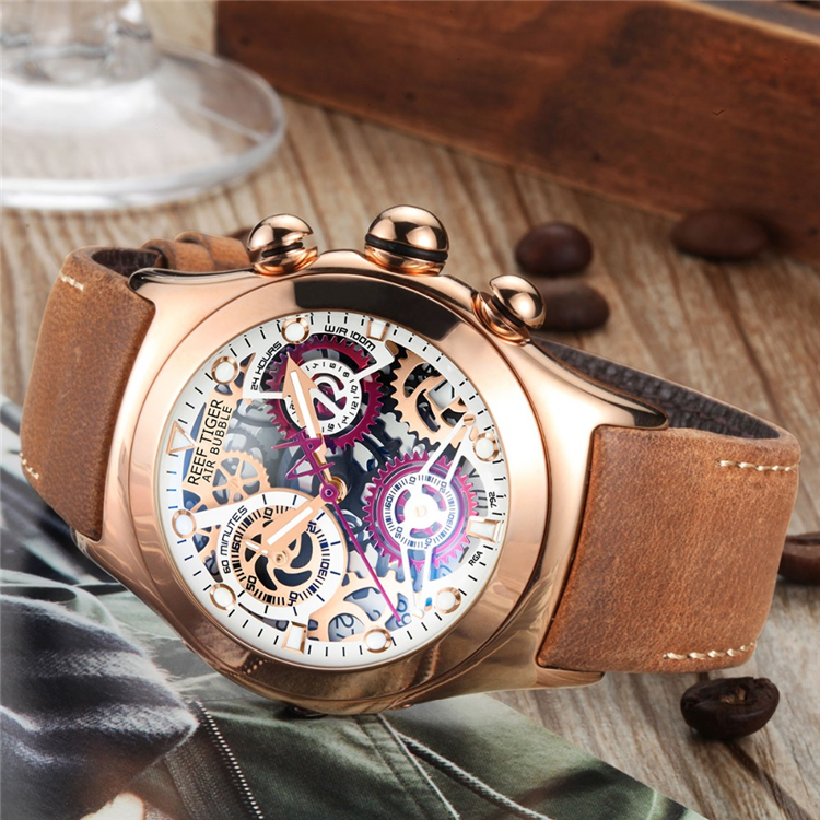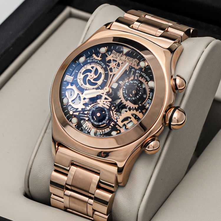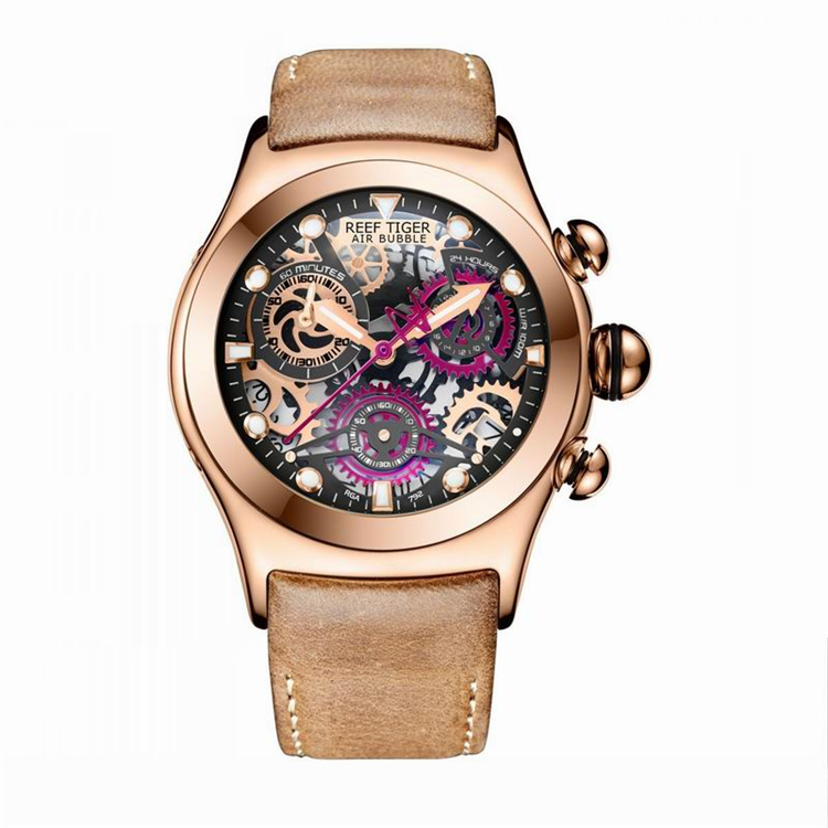 REEF TIGER RGA792 Chronograph Sport Watches for Men Skeleton Dial with Date Three Counters Luminous Rose Gold Unique Watches