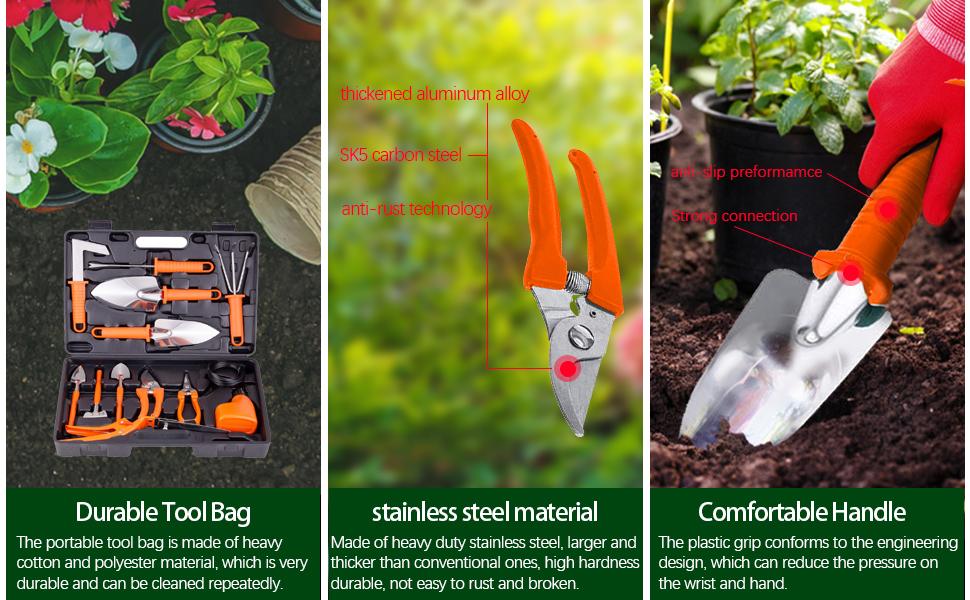 Materials | Handle made of environmental plastic The iron shovel surface with baking paint treatment, which is rust-proof and easy to clean; The scissor has stainless steel blade,also sets a security lock enables you to use more safely; Plastic spray bottle adopted injection molding craft, very durable to use | ||||||