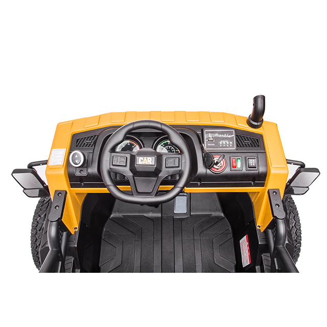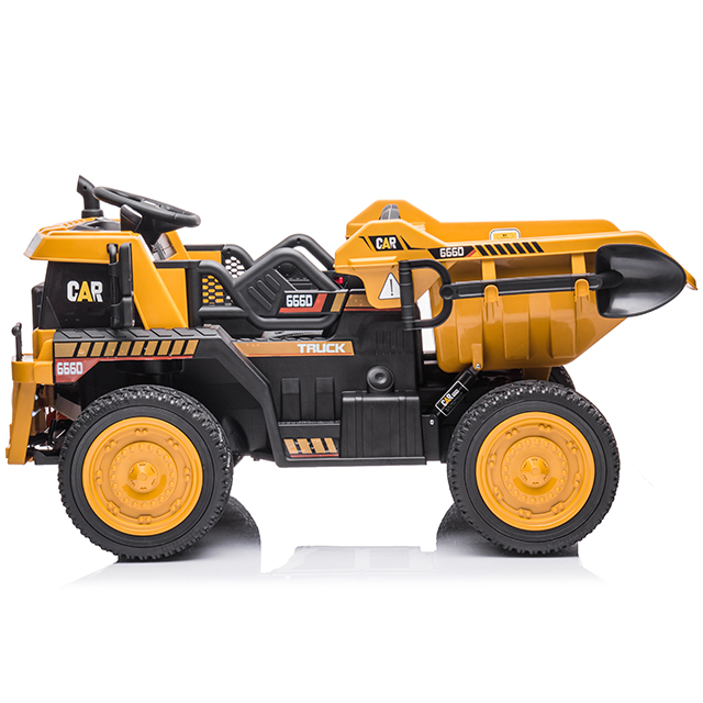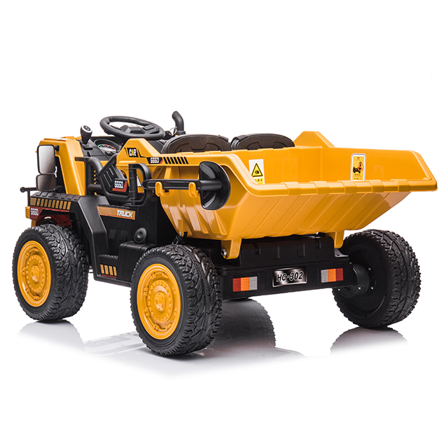 Function | 1. Plastic wheels 2. Plastic cushion 3. 2.4G remote control 4. Rear wheel shock absorption 5. Double door 6. Music player (USB port, Bluetooth function, power display, volume adjustment) 7. With light and music (real car start sound, reversing sound) 8.Forward and backward function 9. Slow start 10. Key start switch 11. Tipping bucket |