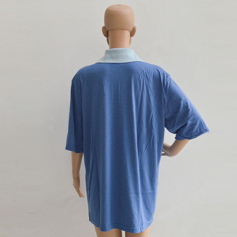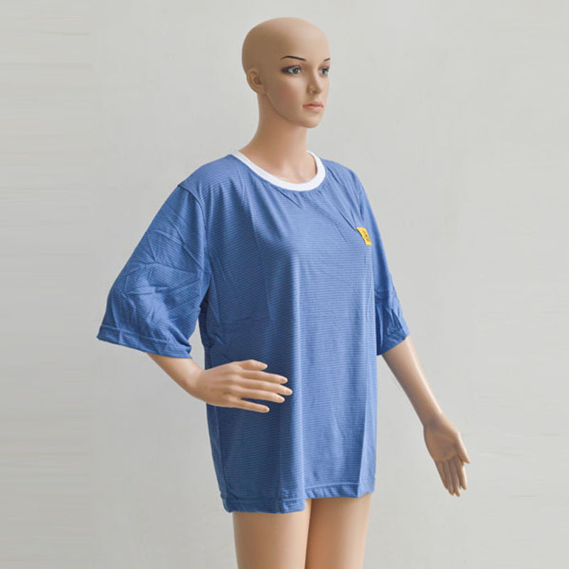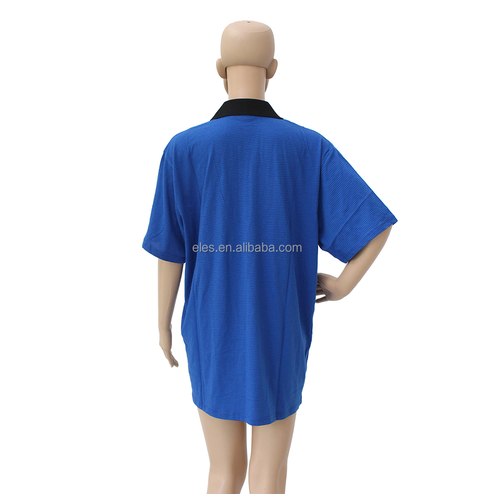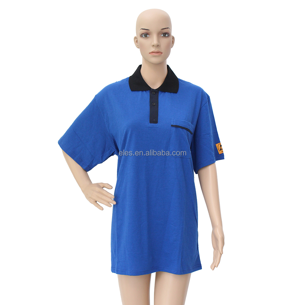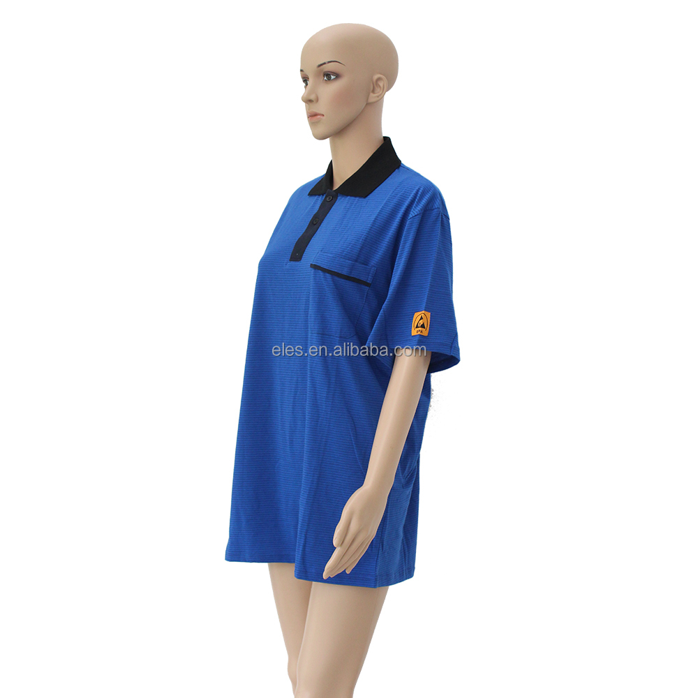 Antistatic T-shirt&polo shirt for use in EPA Unisex design Nickel free snaps, plastic snaps are available ESD logo on or above breast pocket, or on cuff Short sleeve, or long sleeve Antistatic fabric 96% cotton, 4% black conductive fiber Weight: 155g/sqm Size: S, M, L, XL, 2XL and etc Color: blue, other colors are available based on MOQ 600pcs Surface resistance: 10^6-10^9 ohm Special size, colors and embroidery are available upon request