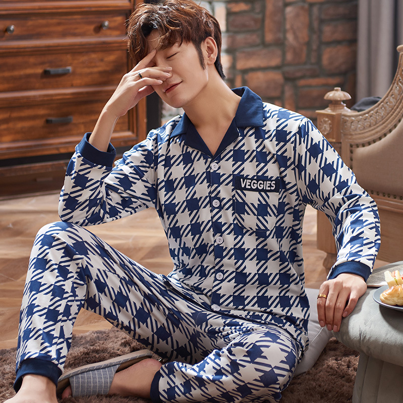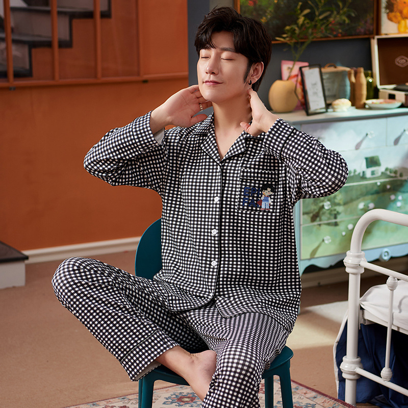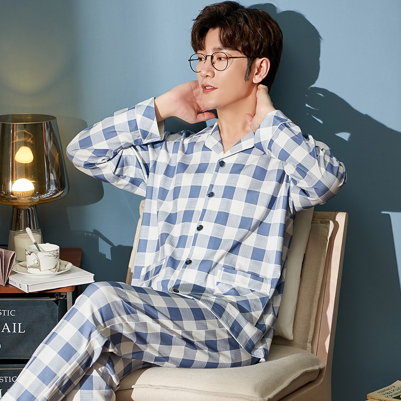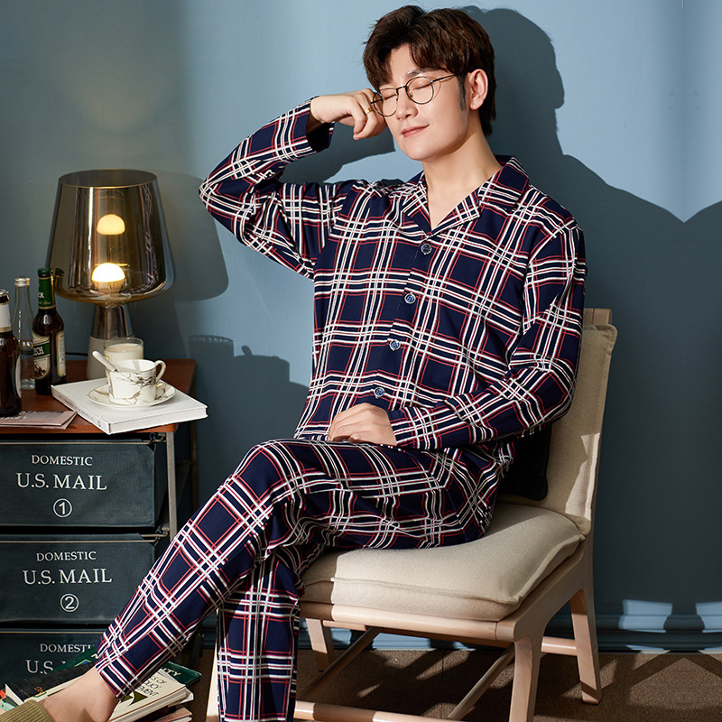 Men's Pajamas Long Sleeve Large Size Thin Night Dress Cell Print Cotton Sleepwear For Men