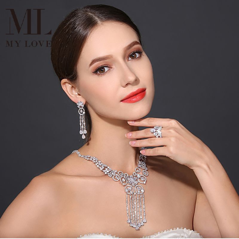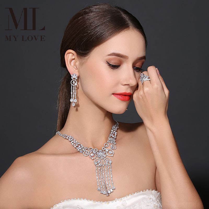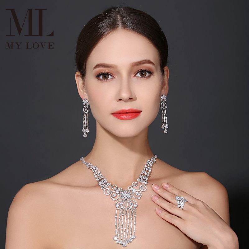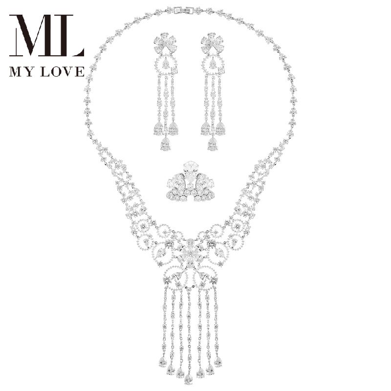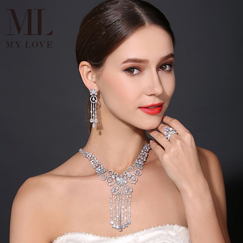 High Quality Rhodium Color Cubic Zirconia Bridal Jewelry Set Wedding Necklace Earring Ring Sets