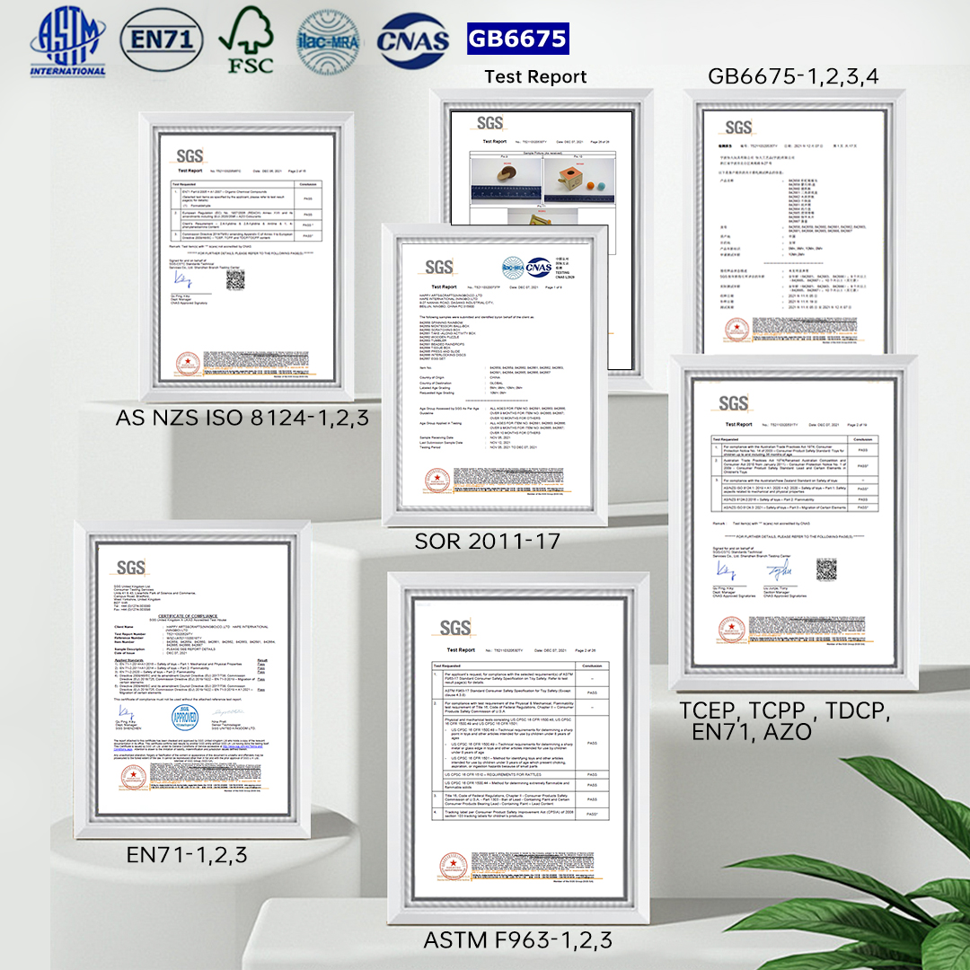 Certificates: | EN71, ASTM F963, SOR2016, ISO8124 (AS/NZS), GB6675. |