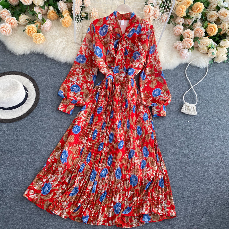 Wholesale Spring Fall Women Long Sleeve Printing Maxi Casual Pleats Dresses For Ladies