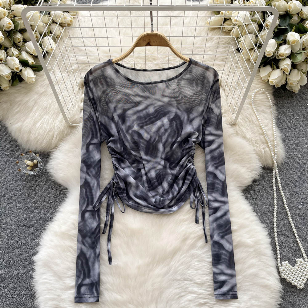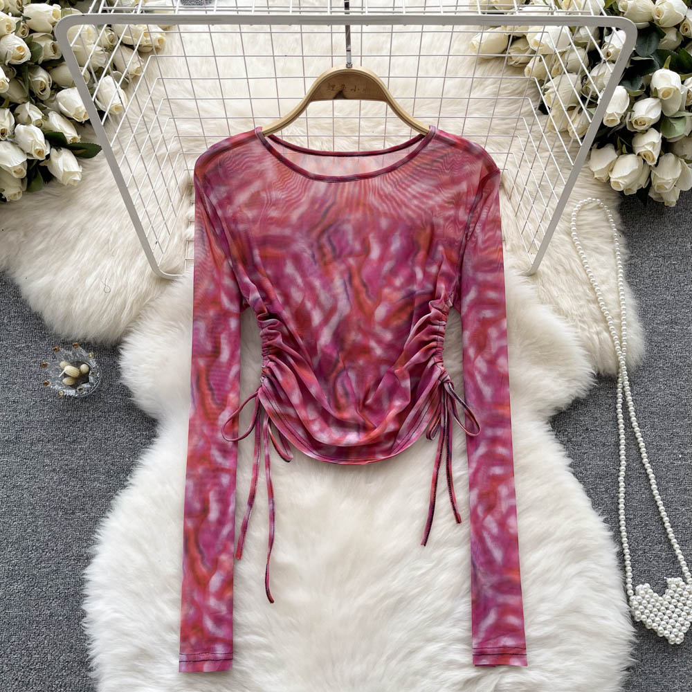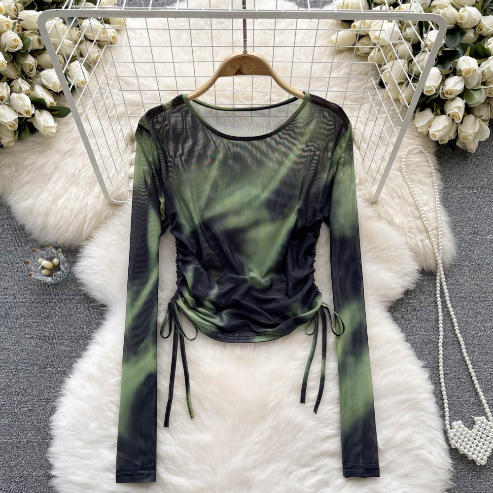 French Retro Tie-Dye Drawstring Round Neck T-Shirt Tops Fall Women'S Long Sleeve Slim Bottoming Shirt