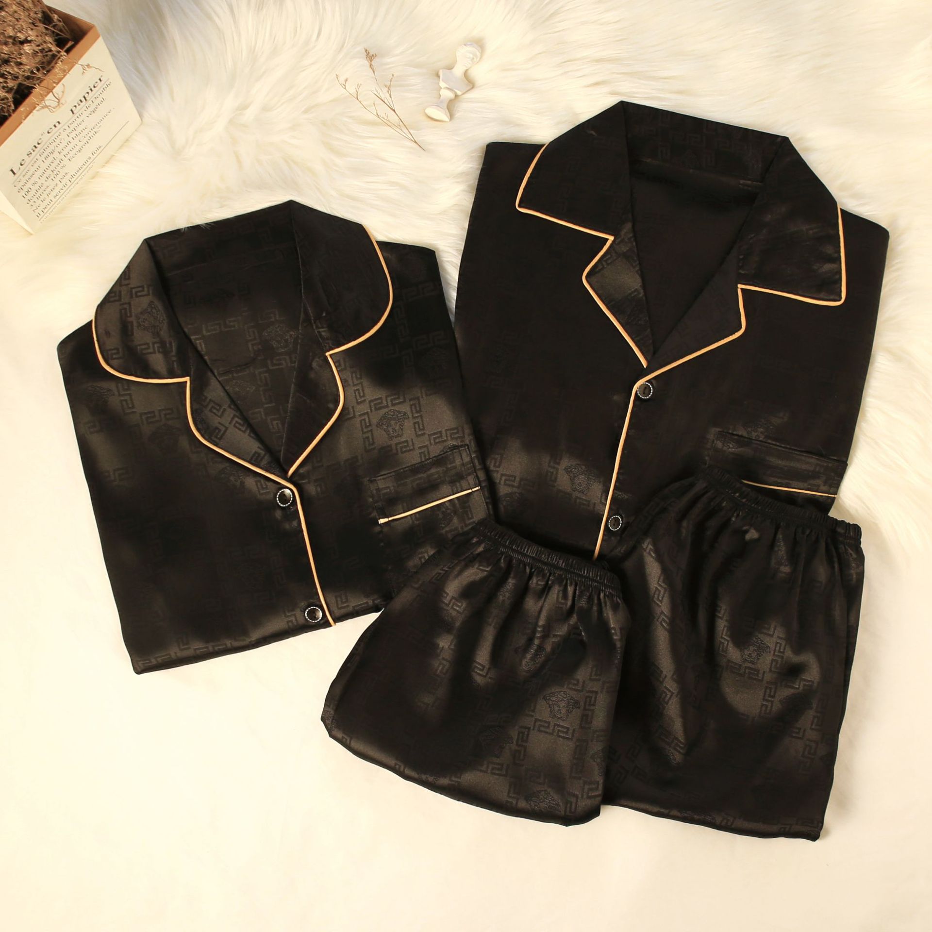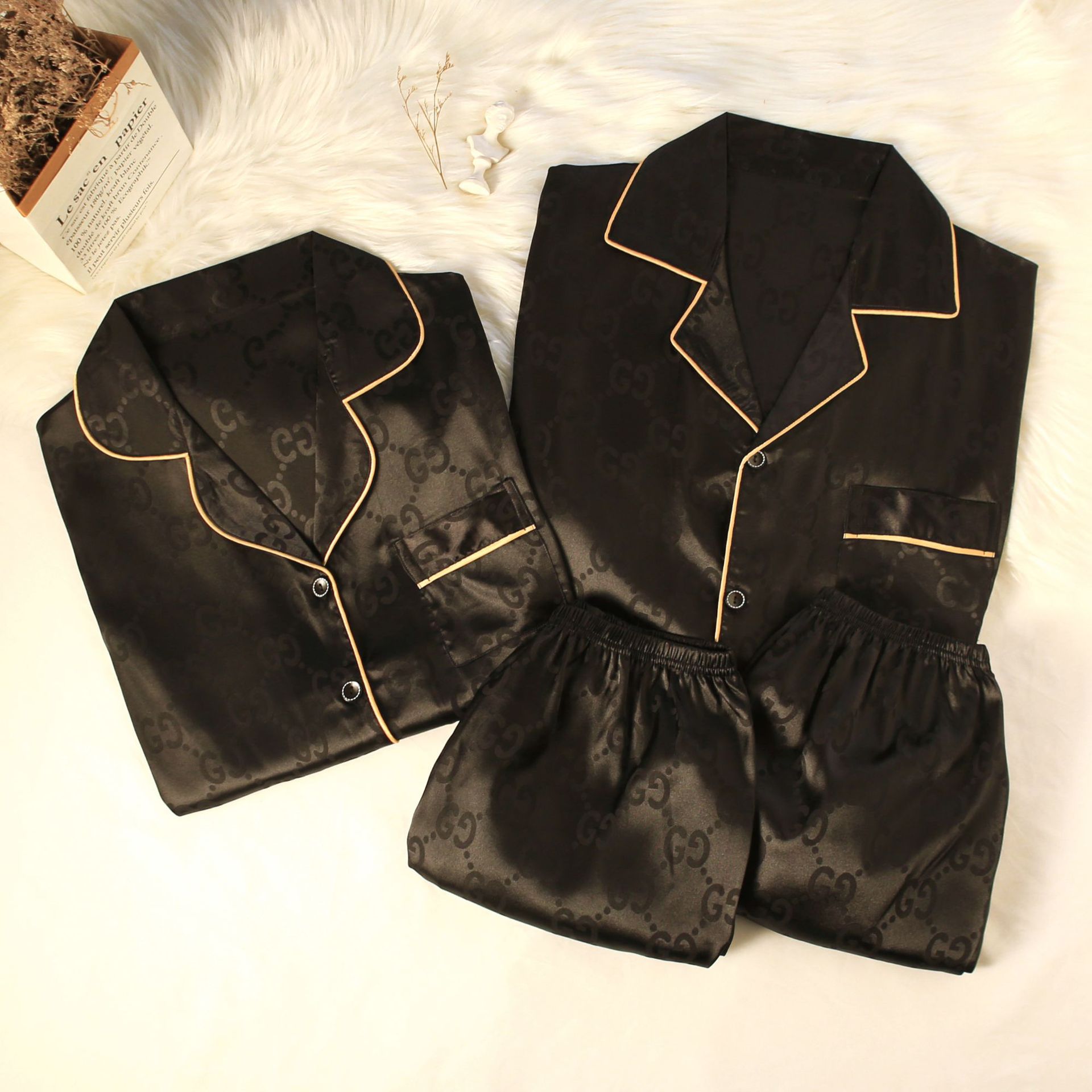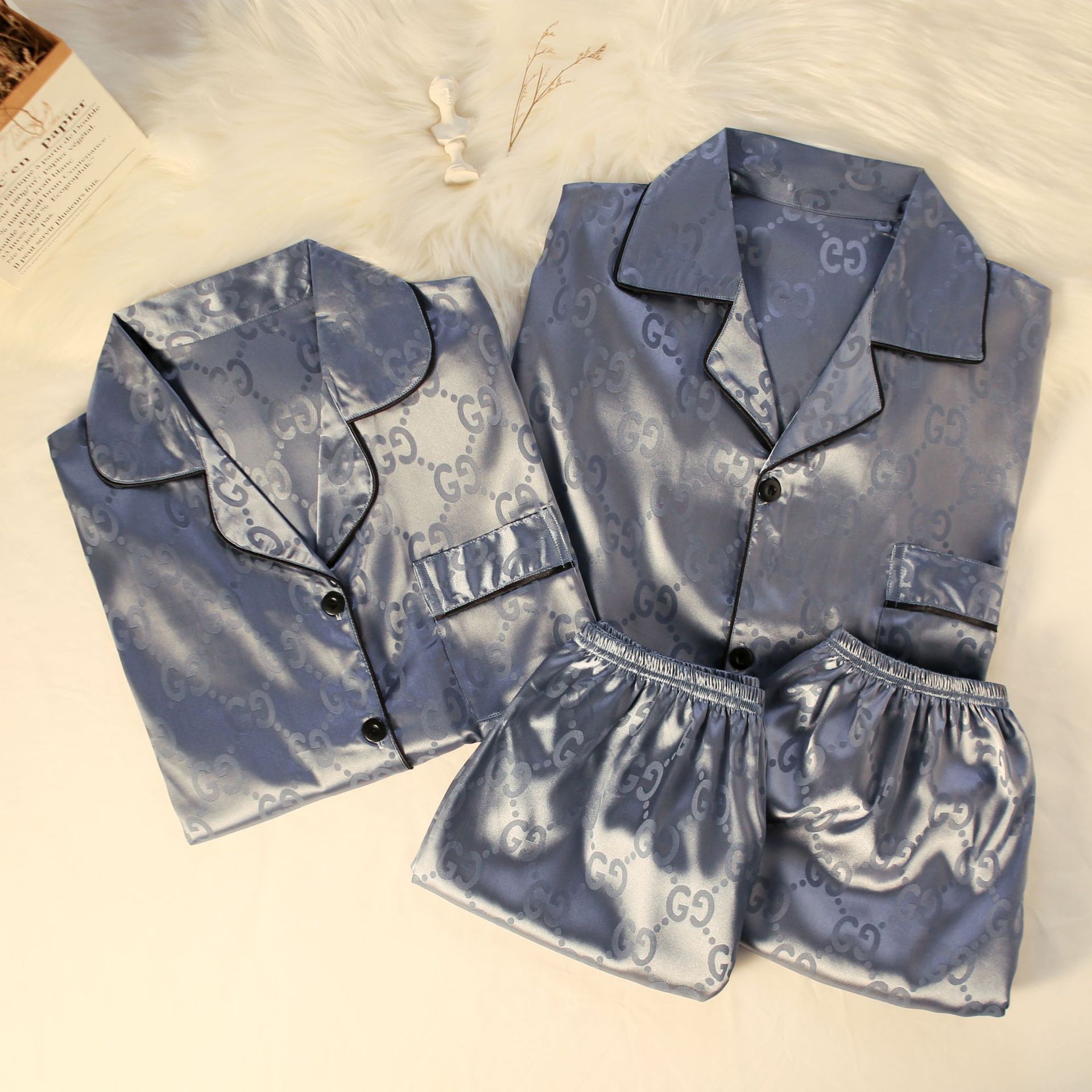 2201 Solid Print Ice Silk Satin Women's And Men Sleepwear Short Sleeve Sets Couple's Pajamas