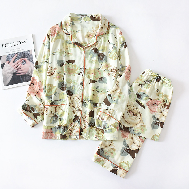 1. Item | Spring Summer New Tropical Plant Print 100% Viscose Skimt 3 Piece Set Long Sleeve Pants Ladies Pajamas Set Women's Sleepwear |