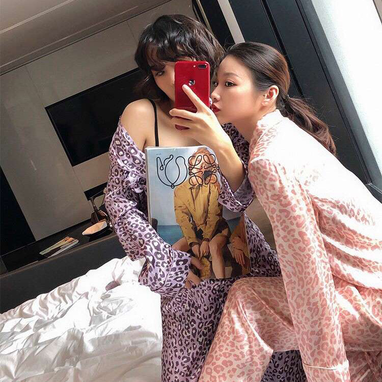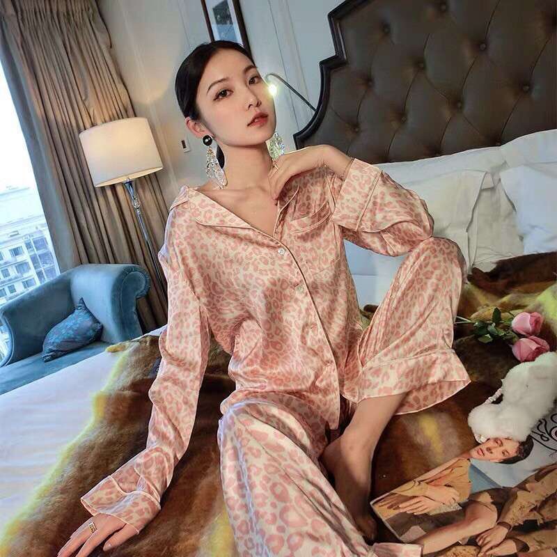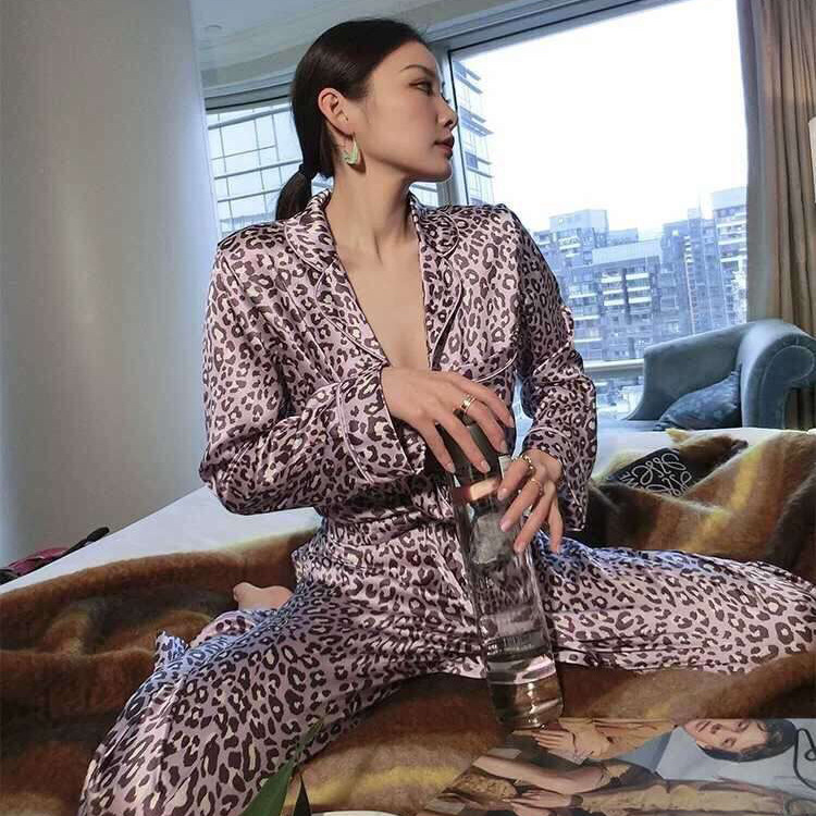 Hot Sale Mulberry Silk Satin Leopard Printing Pajamas Set For Girls Women Pajamas