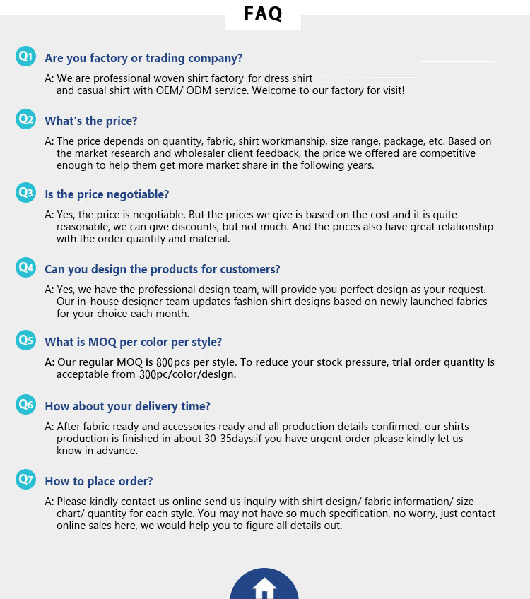 Advantage | 1. Self design ability Our in-house designer team updates fashion shirt designs based on newly launched fabrics for your choice each month; we can also make drawings as per your requirement to save you sample costs. 2. Flexible Order Quantity Our regular MOQ is 800pcs per style. To reduce your stock pressure, trial order quantity is acceptable from 300pc/color/design. 3.Large stock fabric selection We collect new stock fabric from market every month to keep up with fashion all the time. 4. Quick Delivery With a large stock collection of fabrics and designs, advanced equipment and skilled workers, quick delivery is feasible. 5. After-Sales Warranty Within one month after you get the bulk, if there is any quality issue, we will offer a solution and share the cost. Perfect CLOTHING for the whole world. |