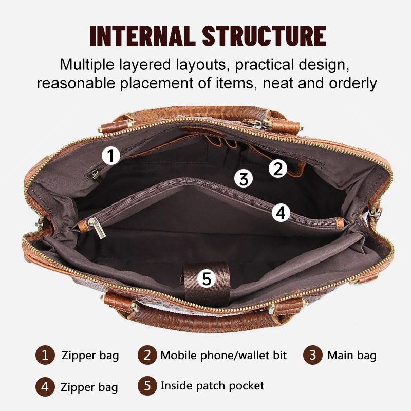 Structure | .Strap can be adjusted .Bronze hardware .There is durable fabric, one laptop compartment, two open pockets, two pen slots and a zipper pocket on wall inside. .There is a zipper pocket on back. | ||||||