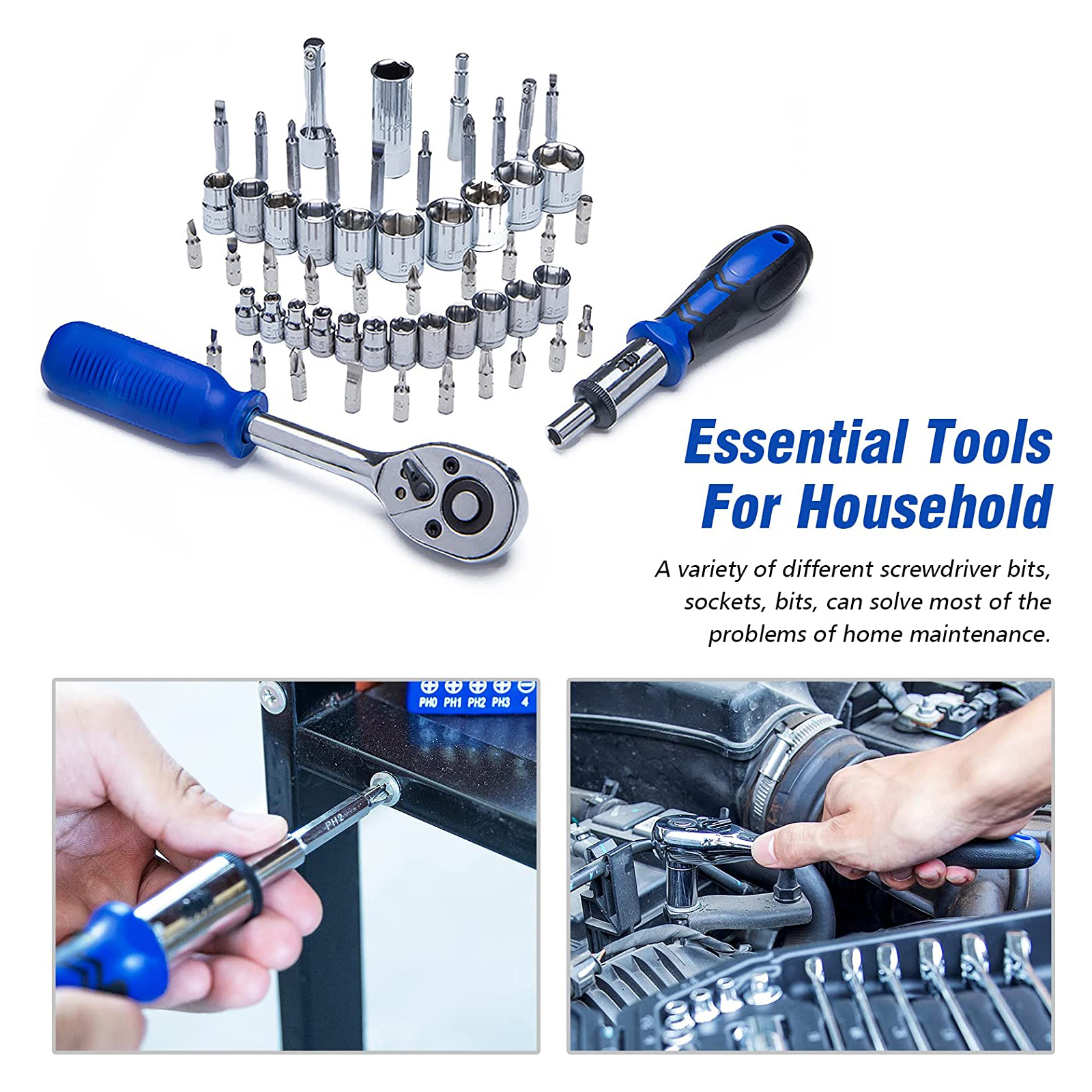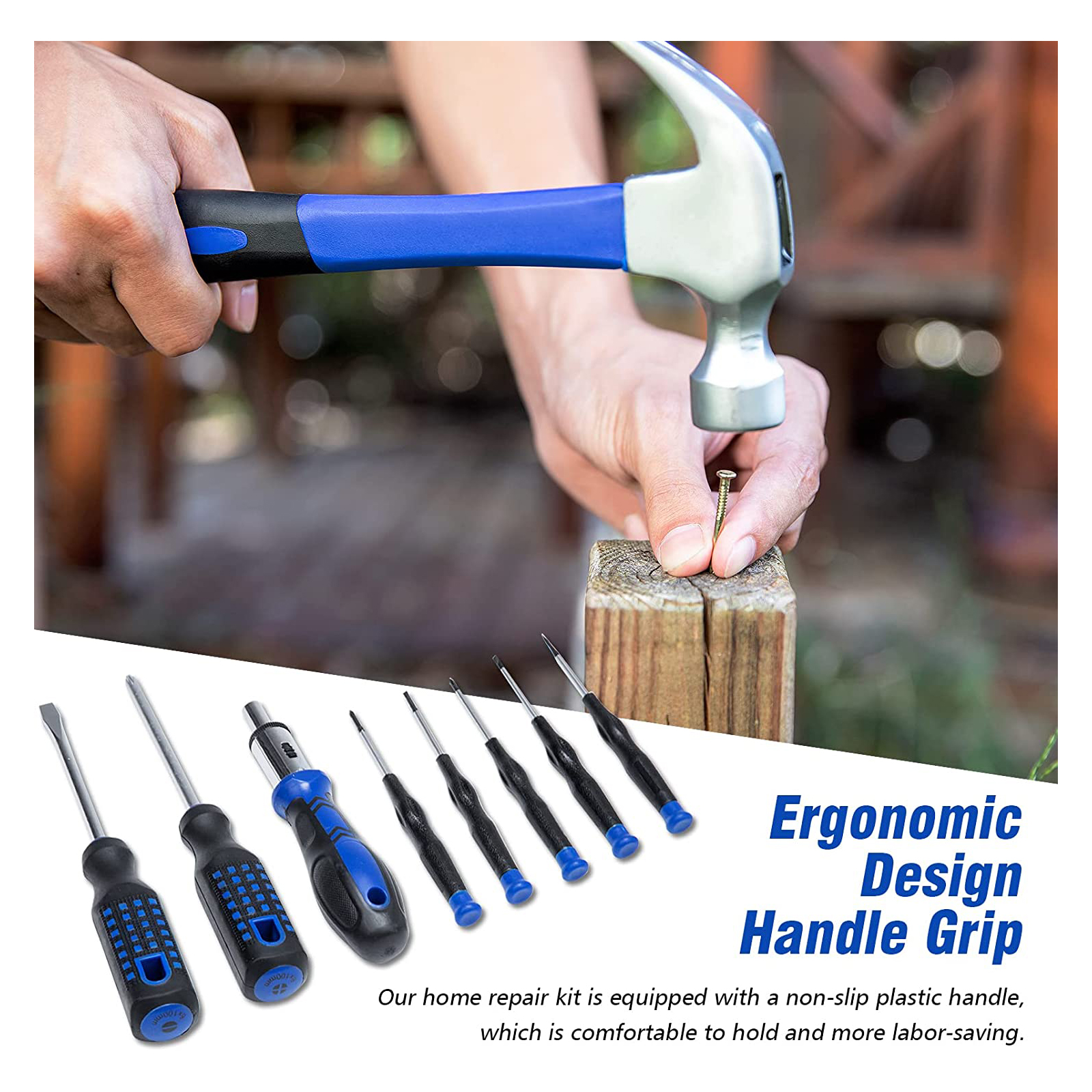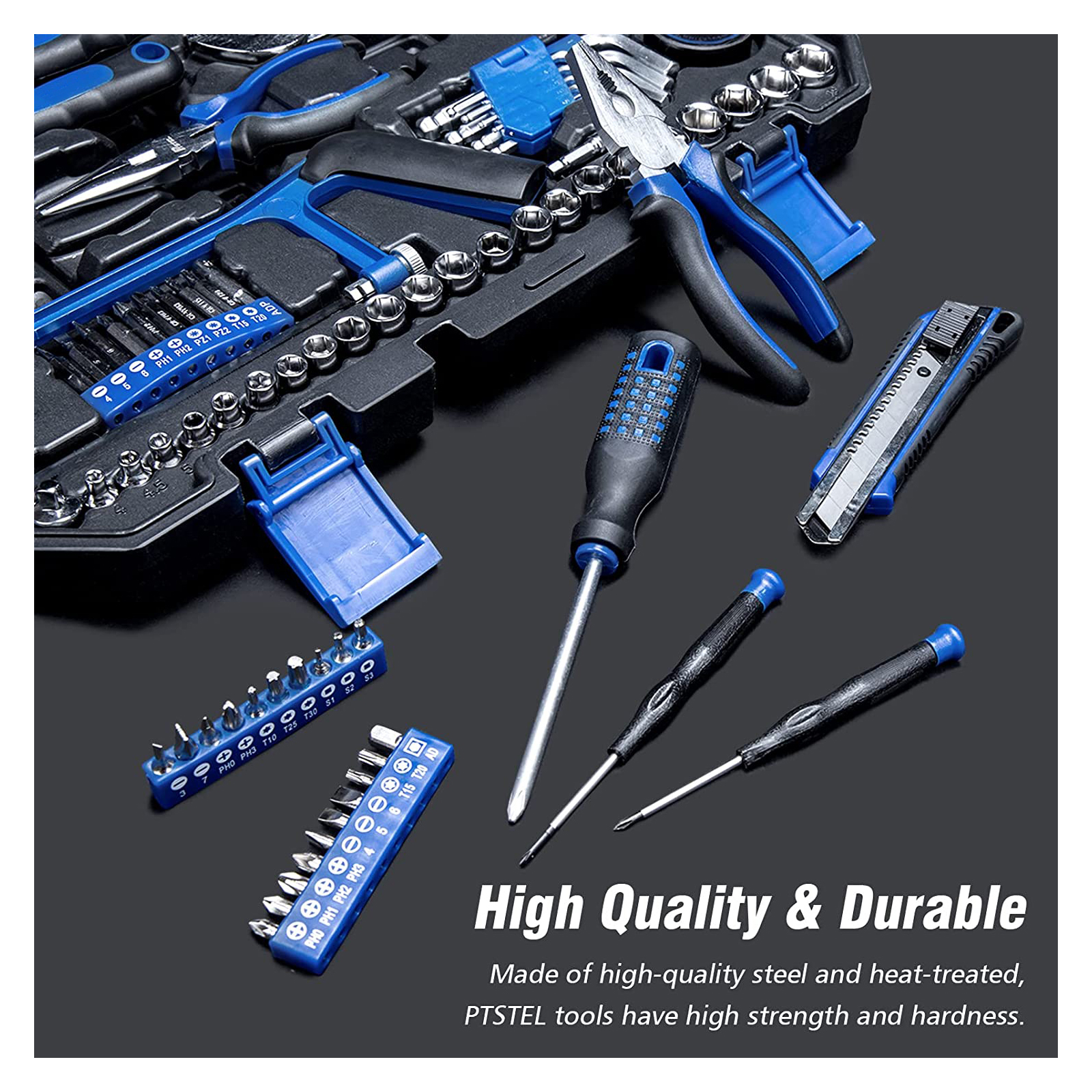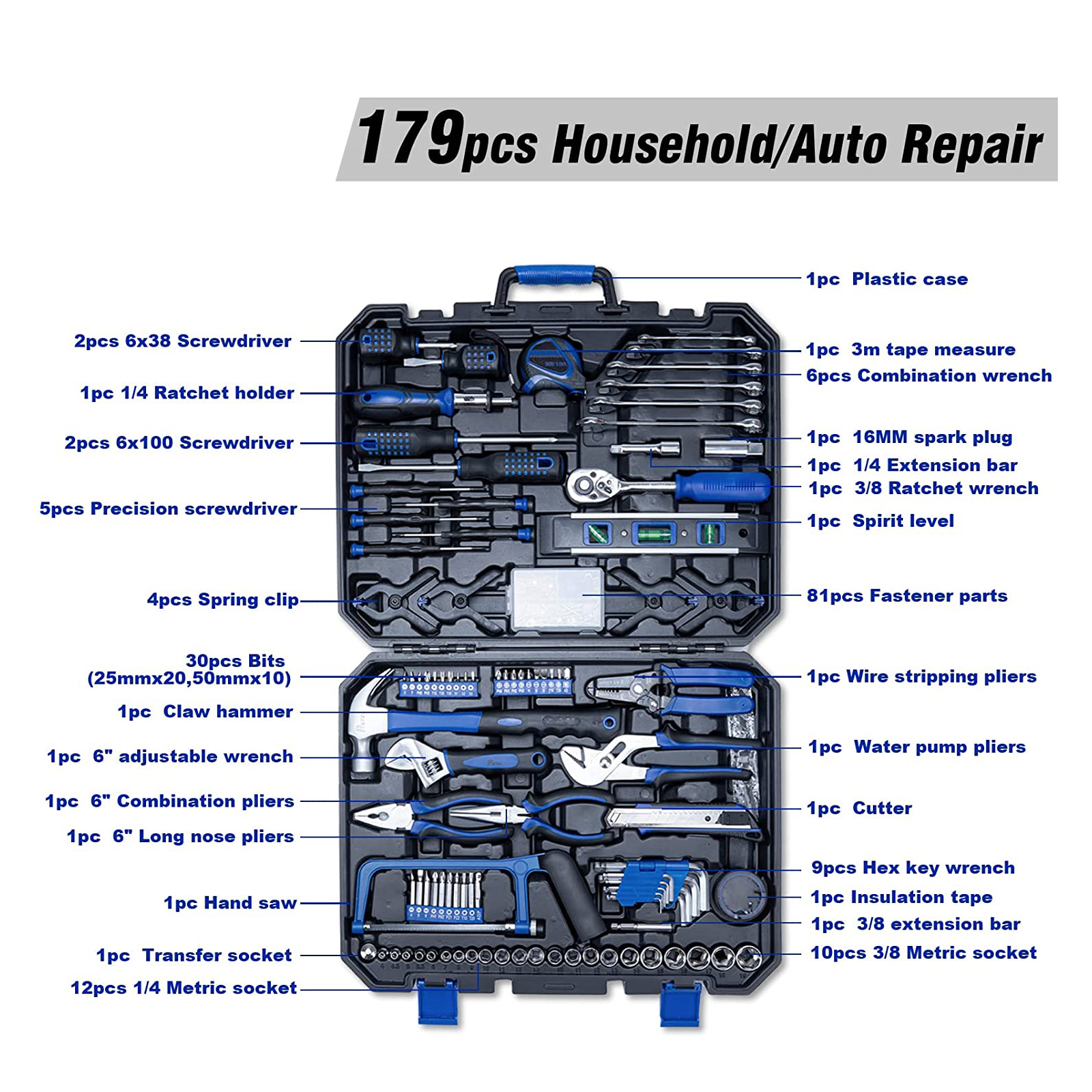 179 pieces tool kit contains the most basic tools for auto repair and home DIY, is the ideal tool for furniture assembly, maintenance, repair projects, essential set for home, office, kitchen, bathroom and garage repair. Package List: 6pcs Combination wrench 2pcs 6x38 Screwdriver 2pcs 6x100 Screwdriver 1pc Insulation tape 1pc 1/4 Ratchet holder 1pc 1/4 Extension bar 12pcs 1/4 Metric socket 5pcs Precision screwdriver 1pc Spirit level 30pcs Bits (25mmx20,50mmx10) 1pc 3/8 Ratchet wrench 10pcs 3/8 Metric socket 1pc 16MM spark plug 1pc Transfer socket 1pc 3/8 extension bar 4pcs Spring clip 1pc Claw hammer 1pc 8" adjustable wrench 1pc 6" Long nose pliers 1pc 6" Combination pliers 1pc Water pump pliers 1pc Cutter 9pcs Hex key wrench 1pc Hand saw 1pc 3m tape measure 1pc Wire stripping pliers 81pcs Fastener parts 1pc Plastic case | ||||||