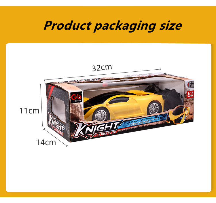 Scale:1:16 Radio Control Style:RC Model Features:wireless remote control car toy Packaging:window box Toy material:plastic Remote control mode:handle 3C configuration category:below 14 years old Packing size:32*11*15 cm Color:red, yellow, blue