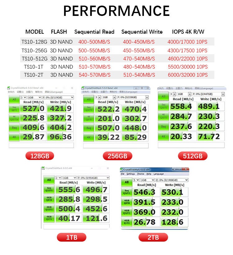 Capacity | 120GB/128GB/240GB/256GB/480GB/500GB/512GB/960GB/1TB/2TB/4TB |