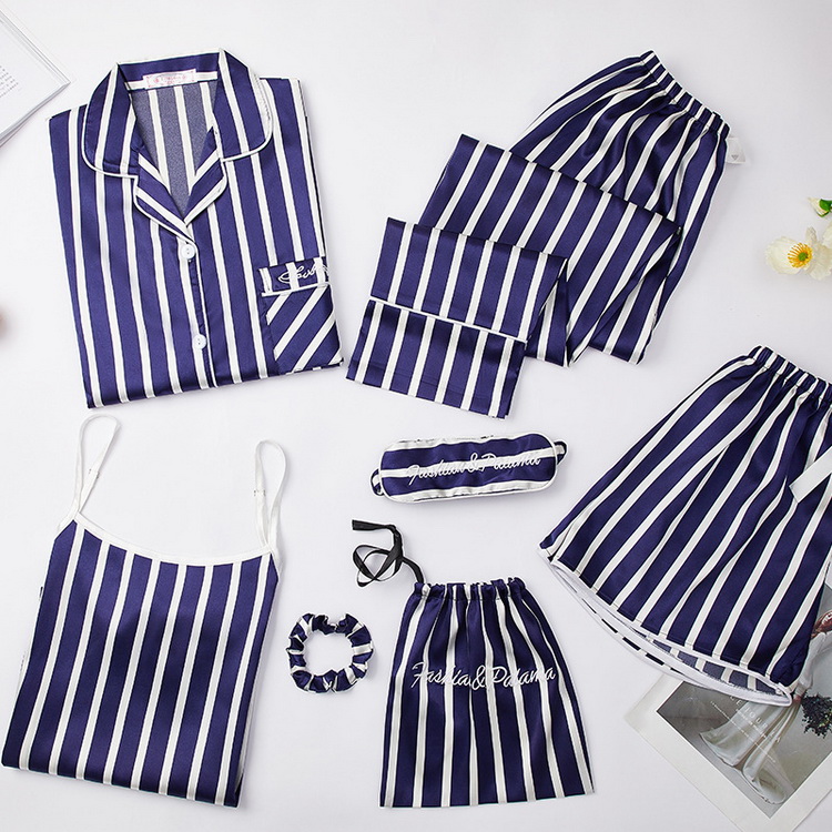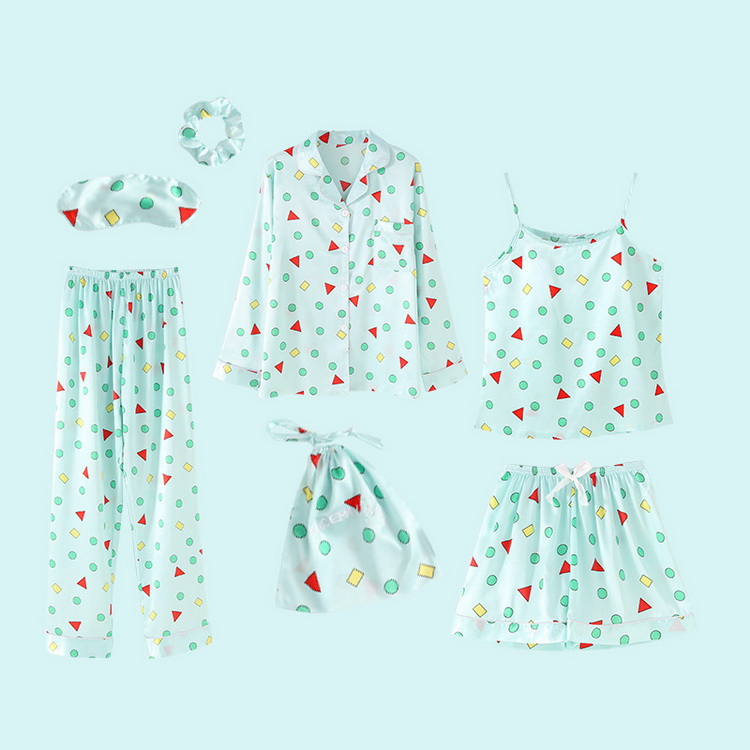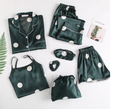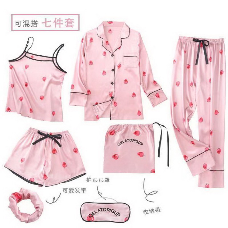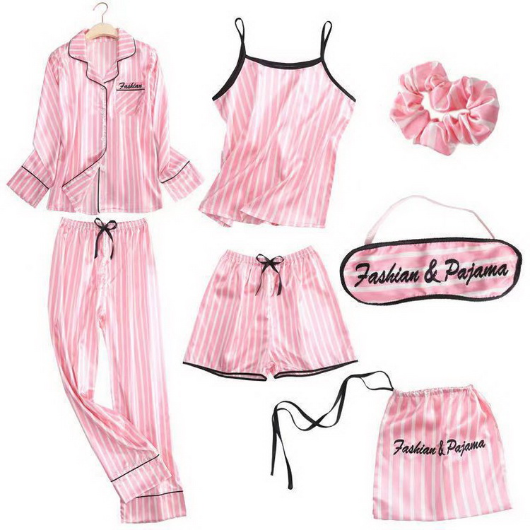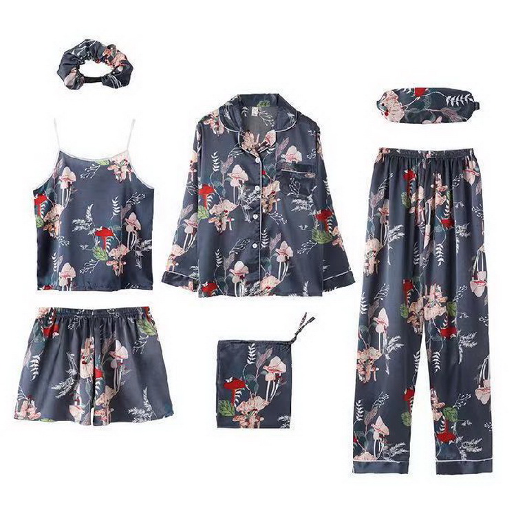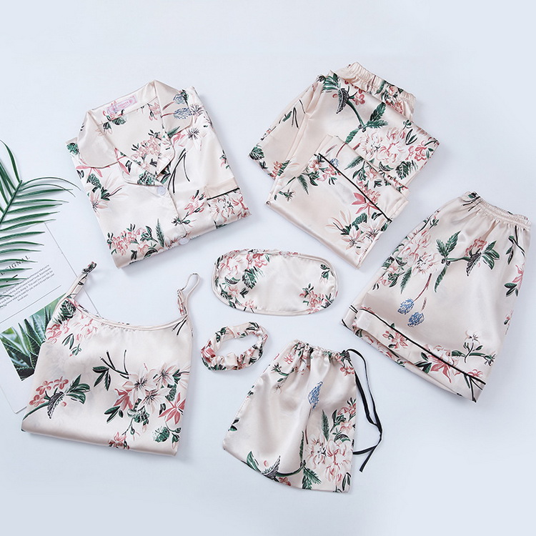 Fat Girls Long Sleeve Silk Satin Pajama Set 7pcs Plus Women's Sleepwear Set