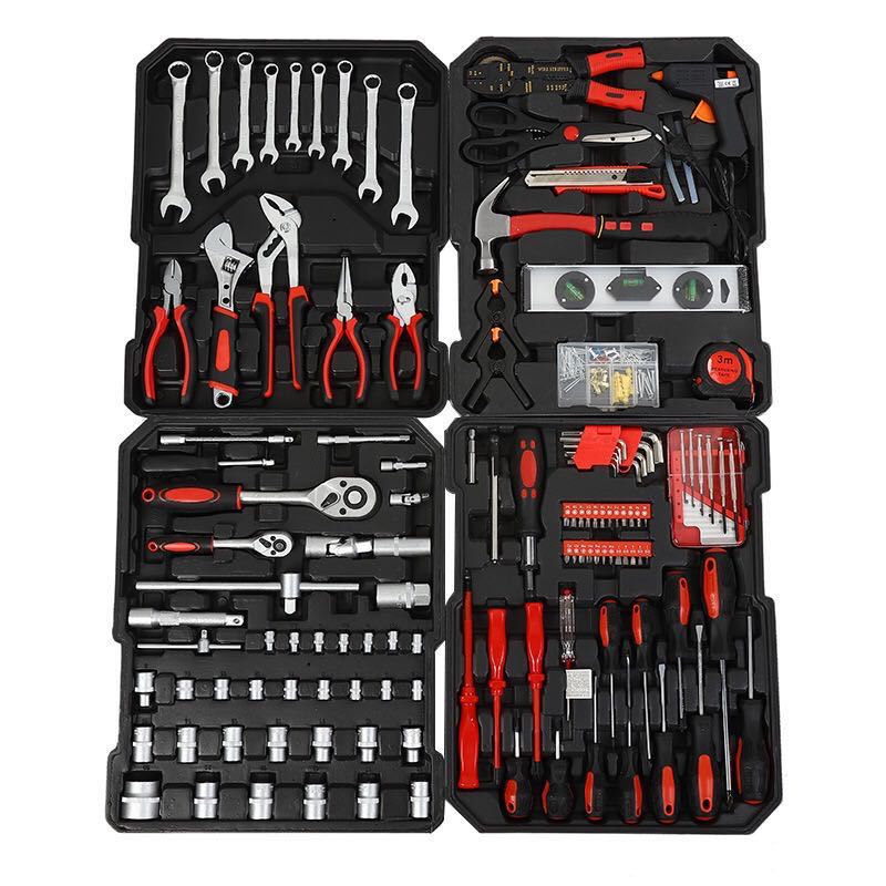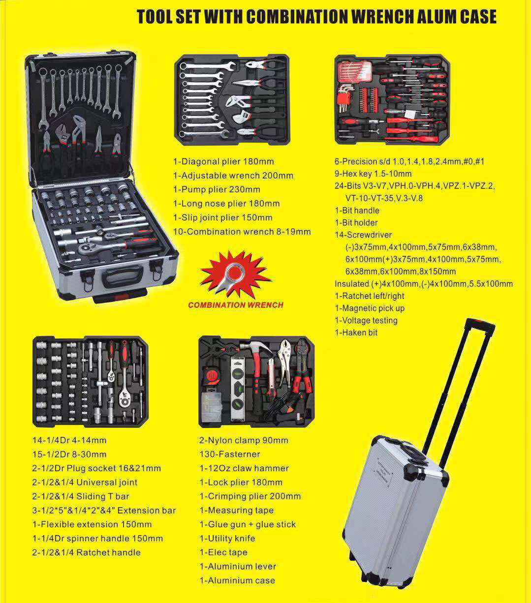 Specifications 1. Tools Quantity: 799Pcs 2. Case Material: Aluminum Alloy/PVC 3. Weight: 30.20lb/13.7kg Feature -- This tool set consists of many tools including spanners, wrench, handle, pressure gauge, etc. -- And it can completely meet your daily needs. It features high quality, sturdy and durable, which has a long service time. -- These tools are easy to use and covers more job, and it's a necessity for life. -- All tools are packed in a sturdy, compact carrying case for easy storage and portability. Each tool fits snugly in its respective position to prevent movement and scratching. Tray 1 15pcs- 1/4’’ Sockets (4, 4.5, 5, 5.5, 6, 6.5, 7, 7.5, 8, 9, 10, 11, 12, 13, 14mm) 14pcs- 1/2’’ Sockets (8, 9, 10, 11, 12, 13, 14, 15, 16, 17, 18, 19, 20, 30mm) 3pcs- 1/2*5’’ & 1/4*2’’ & 1/4*4’’ Socket Extension Bar 2pcs- 1/2’’ Spark Plug Sockets (16, 21mm) 2pcs- 1/2’’ & 1/4’’ Universal Joints 2pcs- 1/2’’ & 1/4’’ Sliding T-Bars 2pcs- 1/2’’ & 1/4’’ Ratchet Spanners 1pc- Flexible Socket Extension (150mm) 1pc- 1/4’’ Spinner Handle (150mm) Tray 2 9pcs- Combination Wrenches (8, 9, 10, 11, 12, 13, 14, 15, 17mm) 1pc- Slip Joint Plier (150mm) 1pc- Adjustable Wrench (200mm) 1pc- Water Pump Plier (230mm) 1pc- Long Nose Plier (150mm) 1pc- Diagonal Cutting Plier (150mm) Tray 3 24pcs- Bits 14pcs- Screwdrivers: 5x Magnetic Philips:(+)3x75, 4x100, 5x75, 6x100, 8x150mm; 4x Magnetic Slotted: (-)3x75, 4x100, 5x75, 6x100mm; 2x Magnetic Stubby Screwdrivers: (+)6x38,(-)6x38mm; 3x Insulated Screwdrivers: (+)4x100, (-)4x100, (-)5.5x125mm 9pcs- Hex Keys 1.5~10mm 6pcs- Precision Screwdrivers: (+)2.4, 3.0mm, (-)1.4, 1.8, 2.4, 3.0mm 1pc- Ratchet Bit Handle 1pc- Magnetic Bit Holder 1pc- Electric Test Screwdriver 1pc- Tire Pen Pressure Gauge Tray 4 1pc- 60 Fasterners (screws, nails, hooks, etc.) 2pcs- Nylon Clamps (90mm) 1pc- Claw Hammar 1pc- Crimping Plier 1pc- Scissors 1pc- Utility Knife 1pc- Measuring Tape (3m) 1pc- Hot Melt Glue Gun (with 2 glue sticks) 1pc- Insulting Electrical Tape 1pc- Aluminium Level Gauge