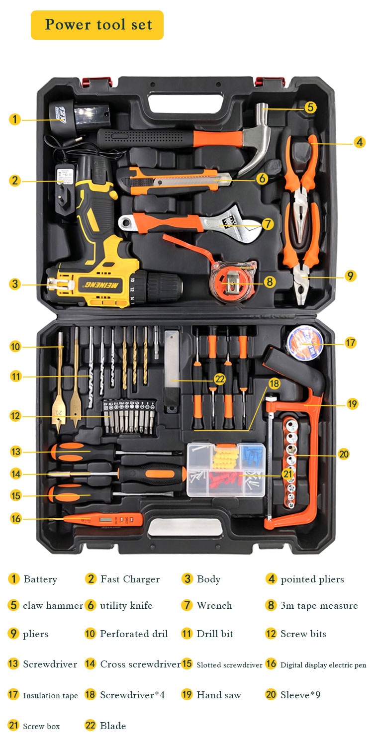 This tool set is equipped with 12V lithium electric drill, also can be equipped with other models, if necessary, please contact us.