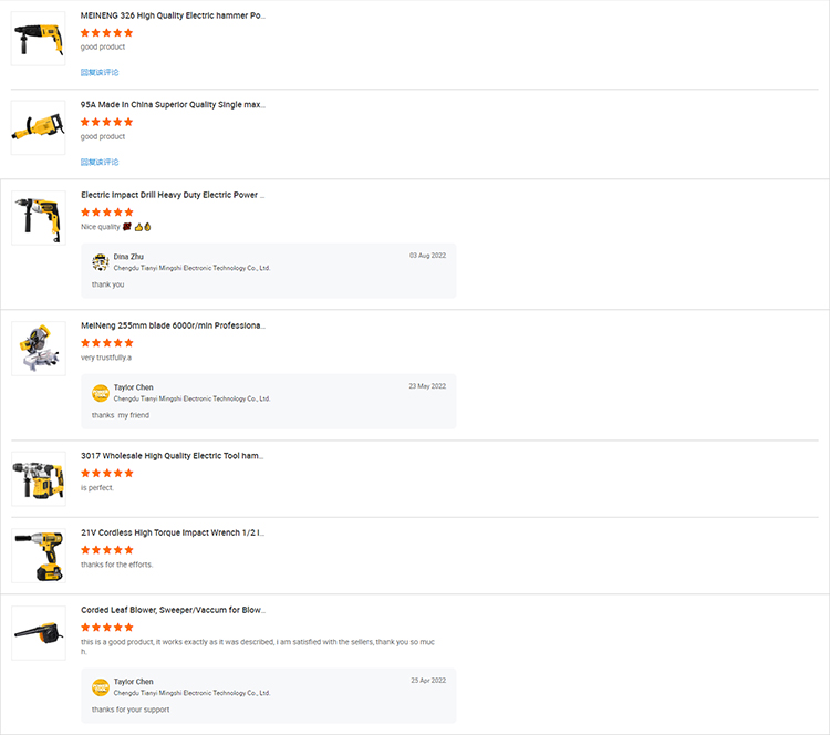 Chengdu Tianyi Mingshi Electronic Technology Co., Ltd. is an enterprise specializing in the production of electric tools / hand tools / hardware accessories. The main products are: electric drill / electric scissors / lithium wrench / electric hammer / electric pick / angle grinder / cutting machine / garden tools / high-pressure air gun / manual tool set / hardware accessories and other products. All products have passed CE, GS and UL certification. The company's brand Meining series products adapt to the development of the global industrial hardware tool industry. The company has exquisite technicians and a high-quality team, which can provide customers with comprehensive after-sales service in time. Professional qualification and brand building are our business objectives. "High quality and reliable price" is the business purpose of Tianyi Mingshi. Tianyi Mingshi has huge advantages in talent, resources, network, scale and experience in the field of tools, strives for survival with quality and development with service, and always adheres to the purpose of keeping promises, It has become a new trading company with high competitiveness and leading advantages. The products are of high quality and low price. Welcome new and old customers to come to the factory to buy!