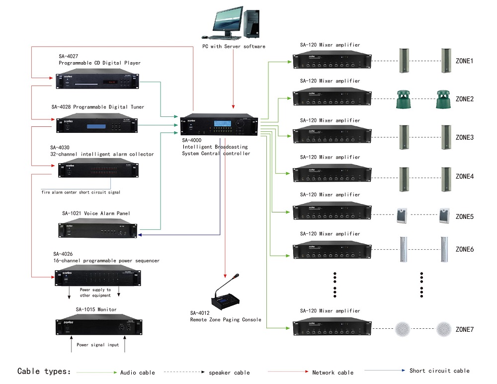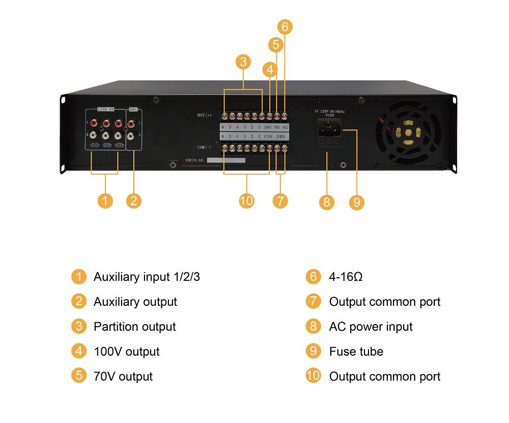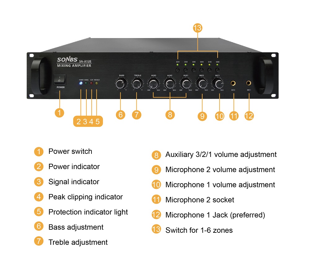 4. With treble-bass adjustment function, with 6-zone function, 6-channel separate zone selection switch.