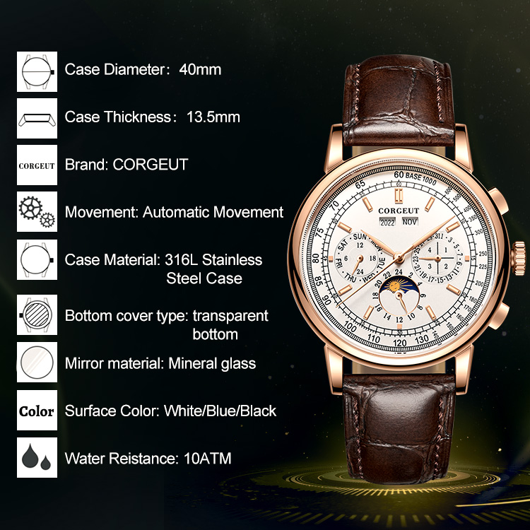 Product Name: | Corgeut Luxury Customized Private OEM Luxury Moon Phase Stainless Steel Men Watch Automatic Movement Mechanical Men Wrist Watch | ||||||
