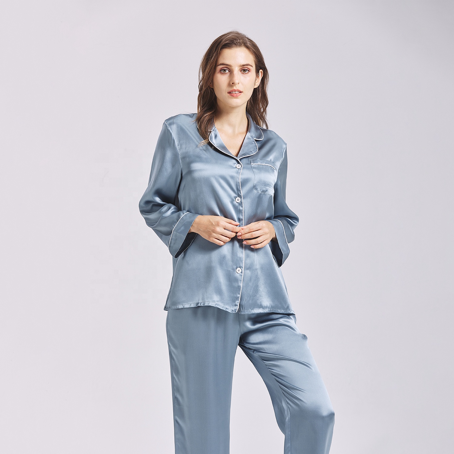 Wholesale Oem&odm Custom Logo 100% Silk Pyjamas Solid Lounge Wear Sexy Misty Blue Sleepwear Organic Silk Pajama Set For Women