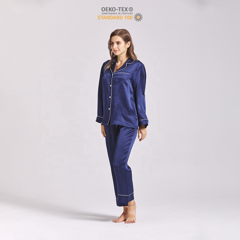 High Quality 22 Momme Navy Blue Silk Pajama Set Long Sleeve Silk Sleepwear Elastic Waist Silk Pyjamas Women